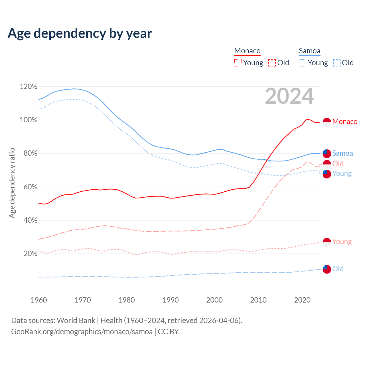 - The share of old-age demographic (65+) in Monaco is 36.2% vs 5.88% in Samoa.