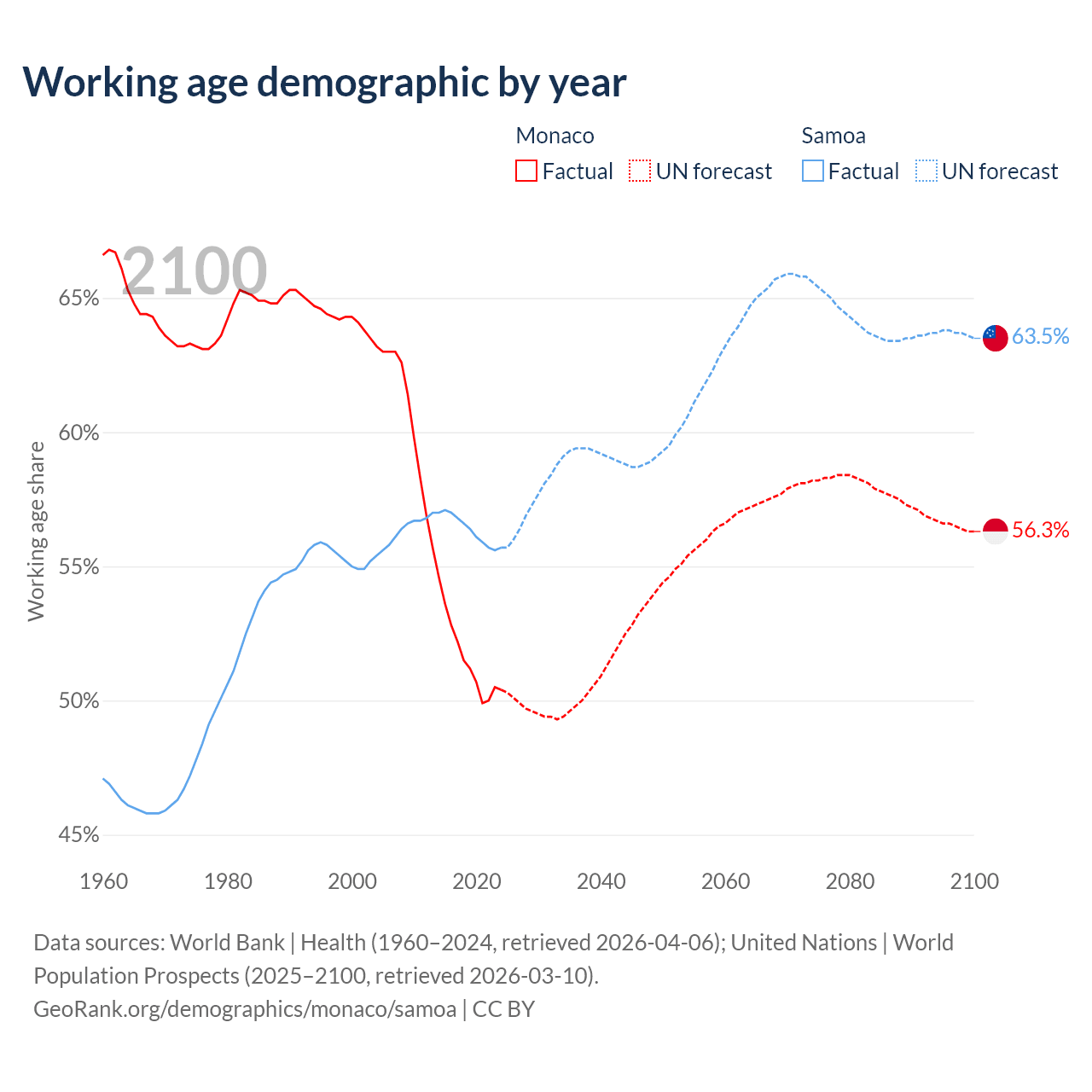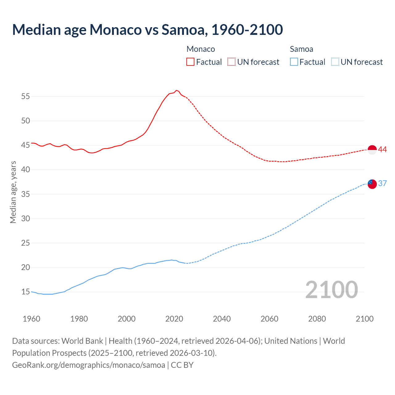 Median age Monaco vs Samoa, 1960-2100