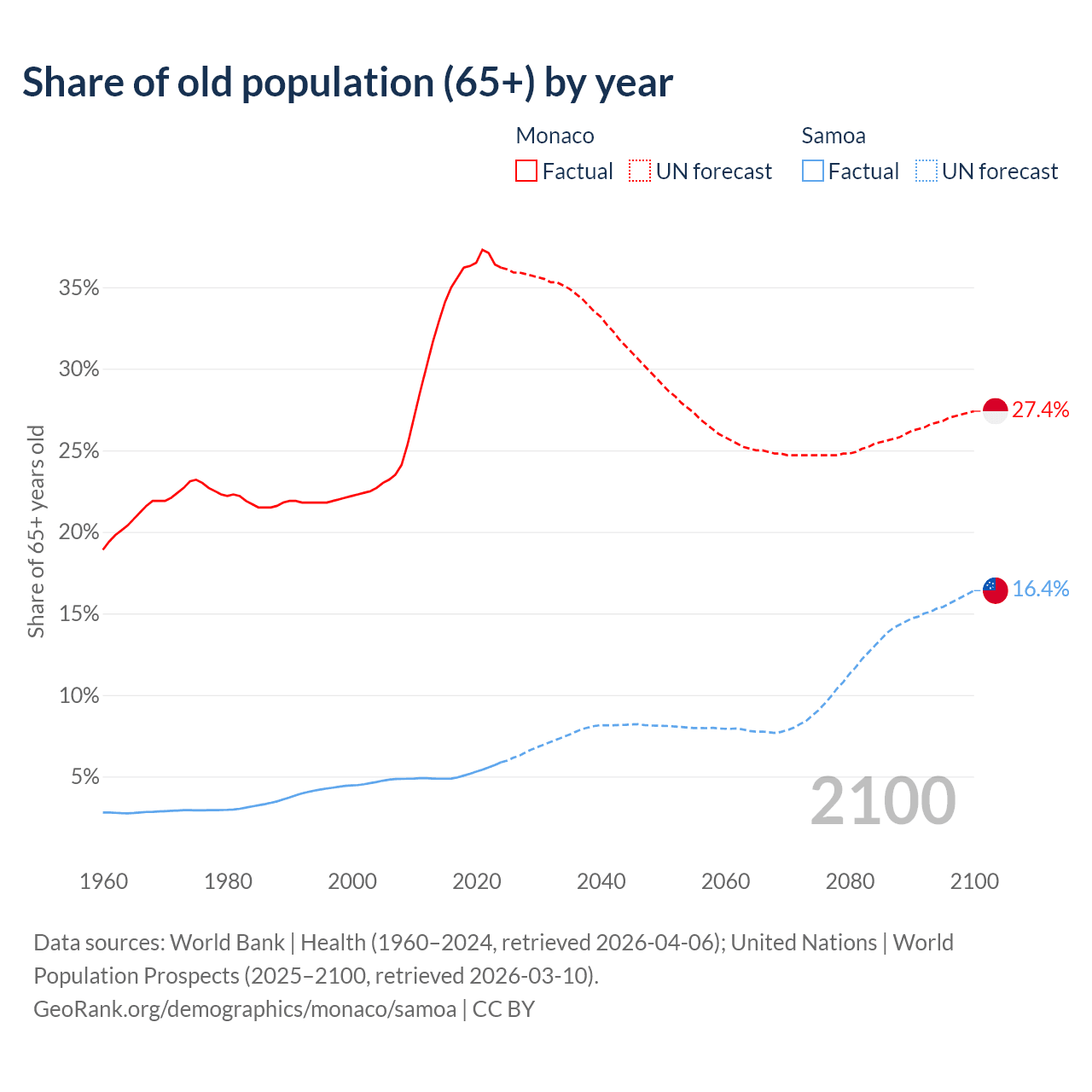 The share of older people aged 65 and over is 36.2% in Monaco and 5.88% in Samoa. Life expectancy in Monaco compared to Samoa .