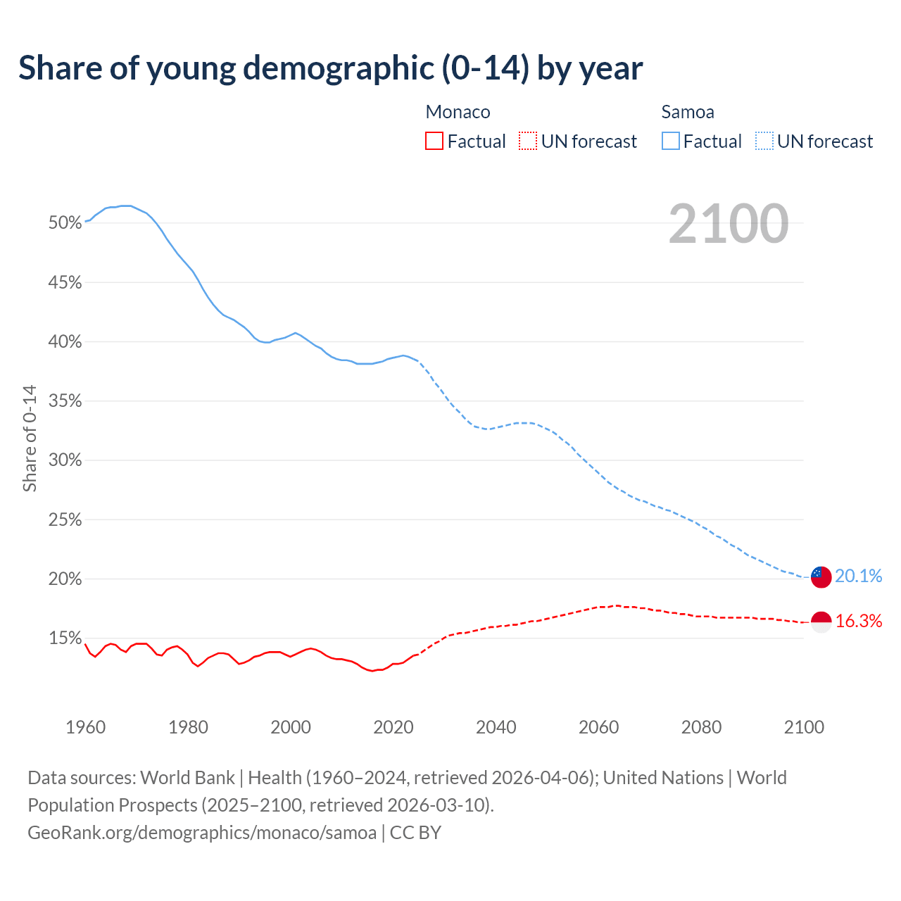 - The share of young demographic (0-15 years old) in Monaco is 13.5% vs 38.5% in Samoa.