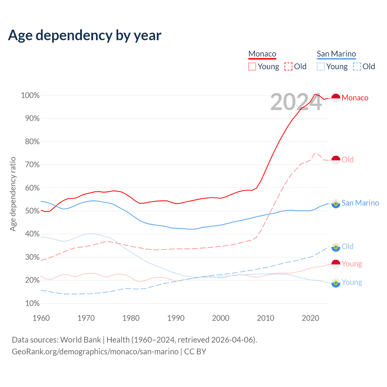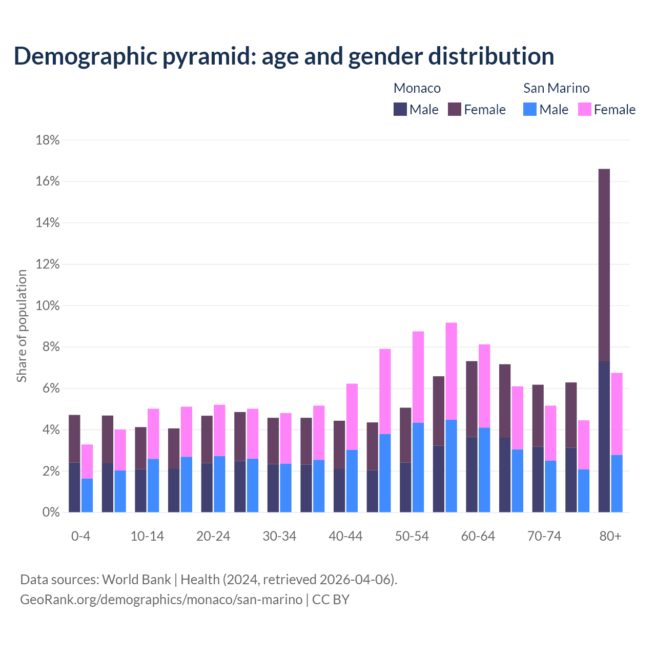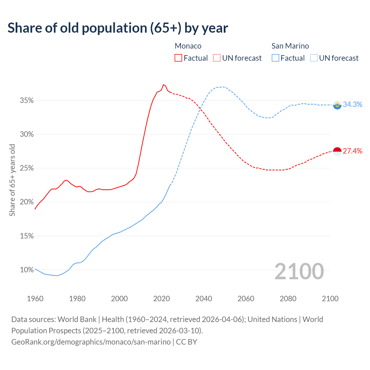 - The share of old-age demographic (65+) in Monaco is 36.2% vs 22.4% in San Marino.