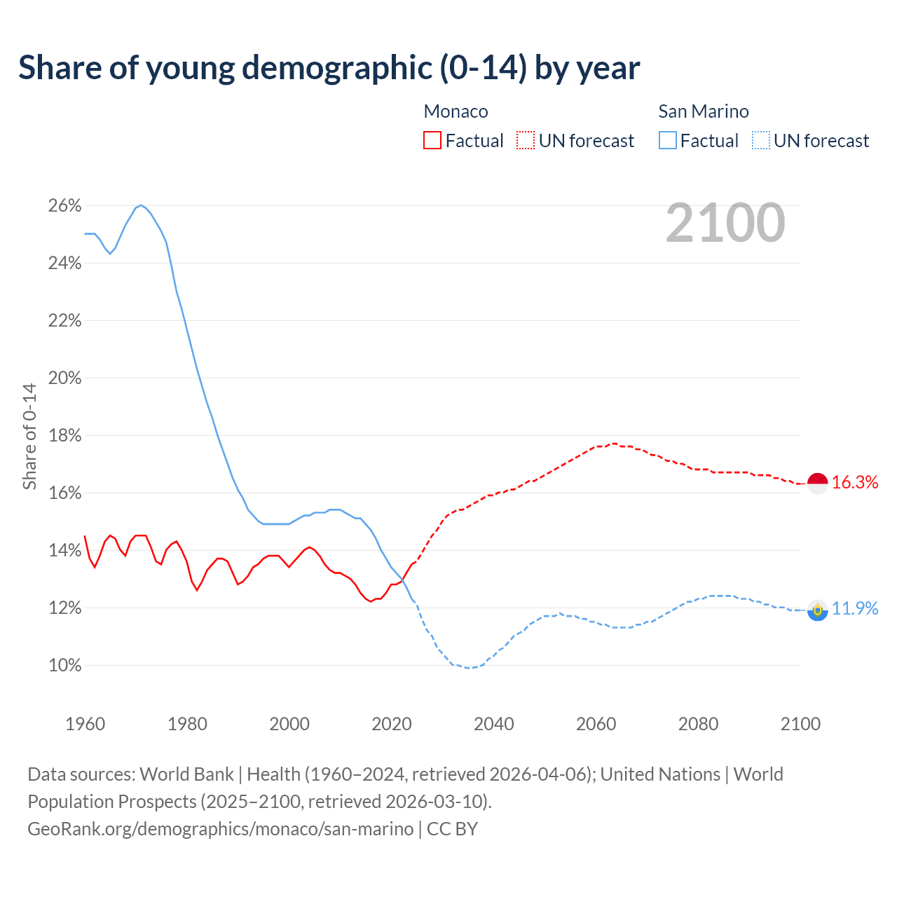 - The share of young demographic (0-15 years old) in Monaco is 13.5% vs 12.3% in San Marino.