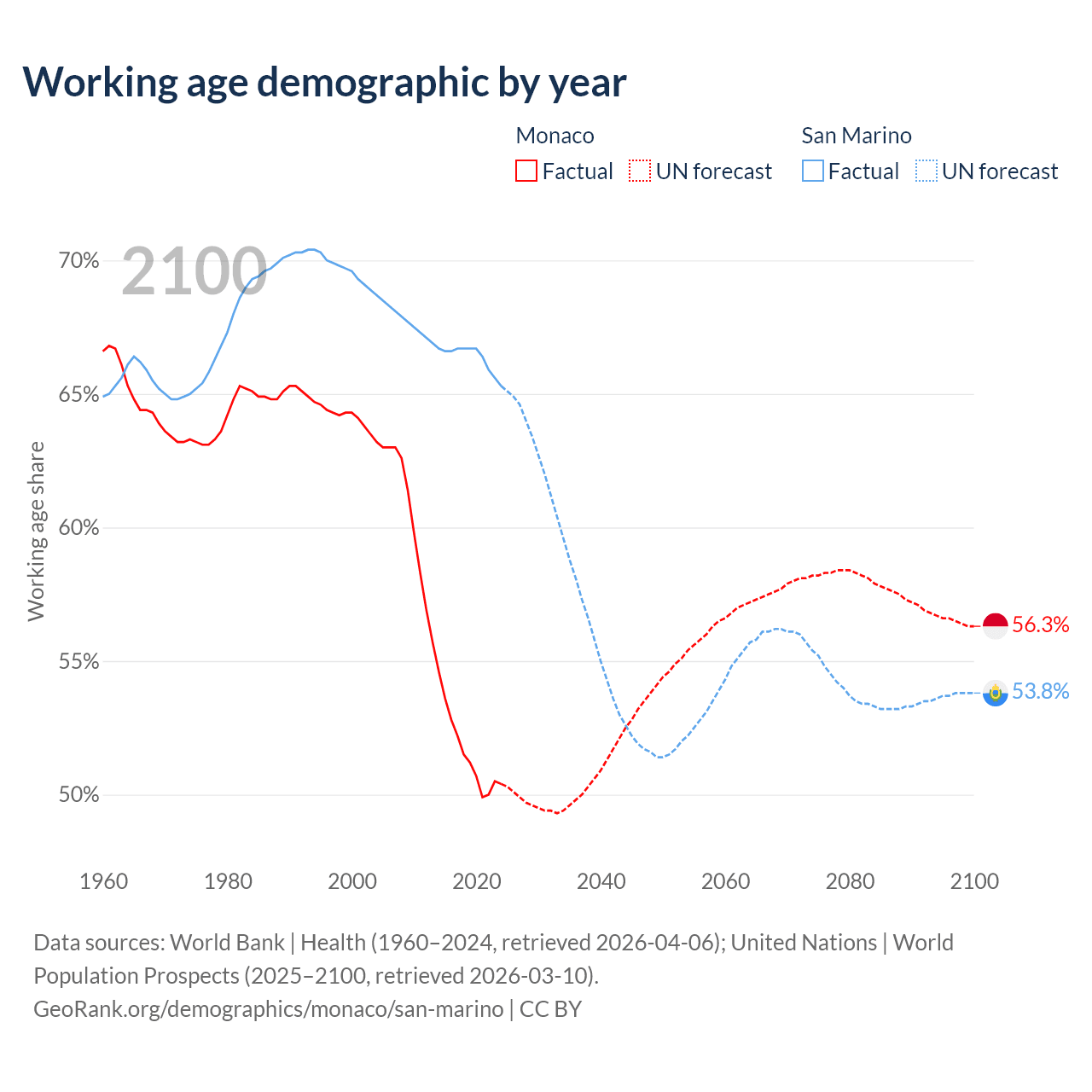 - Monaco has 19.2K working age adults (aged 15-64) vs 22.2K in San Marino.