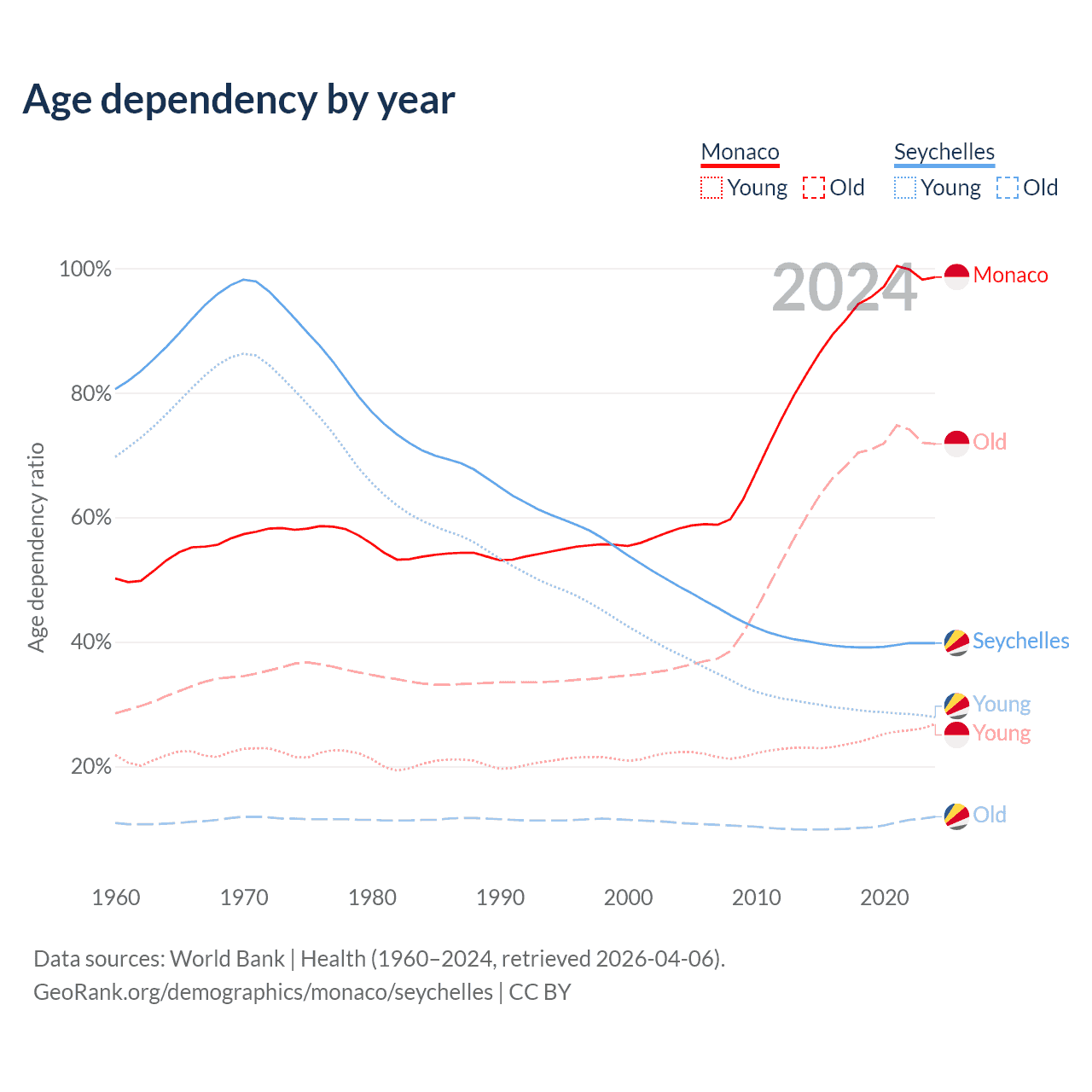 - Monaco is ranked 1/196 by median age (oldest to youngest) vs 76/196 for the Seychelles.