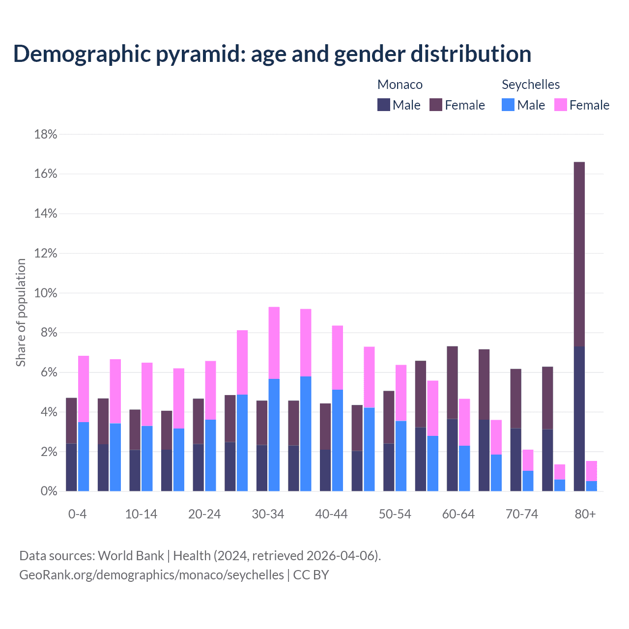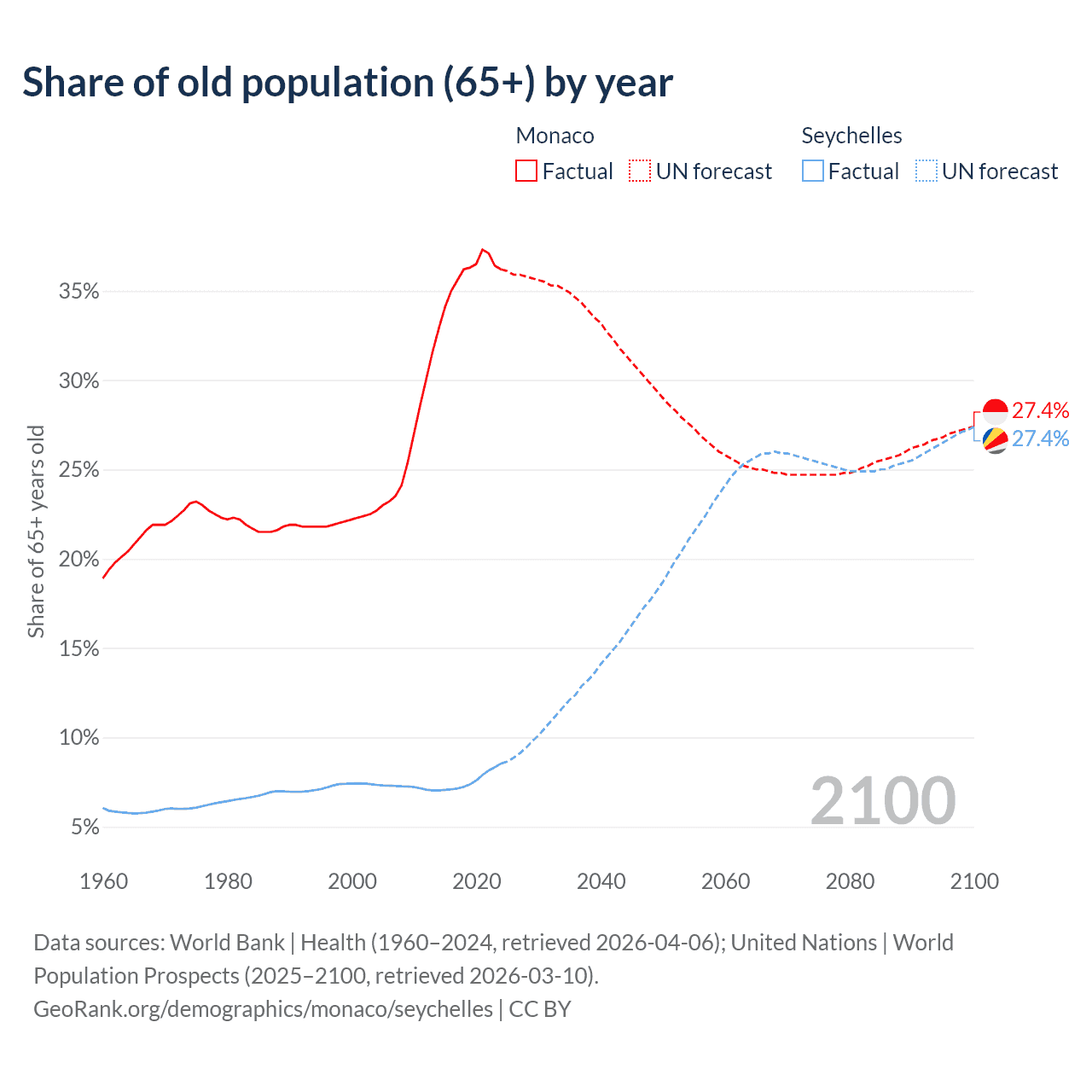 - The share of old-age demographic (65+) in Monaco is 36.2% vs 8.54% in the Seychelles.