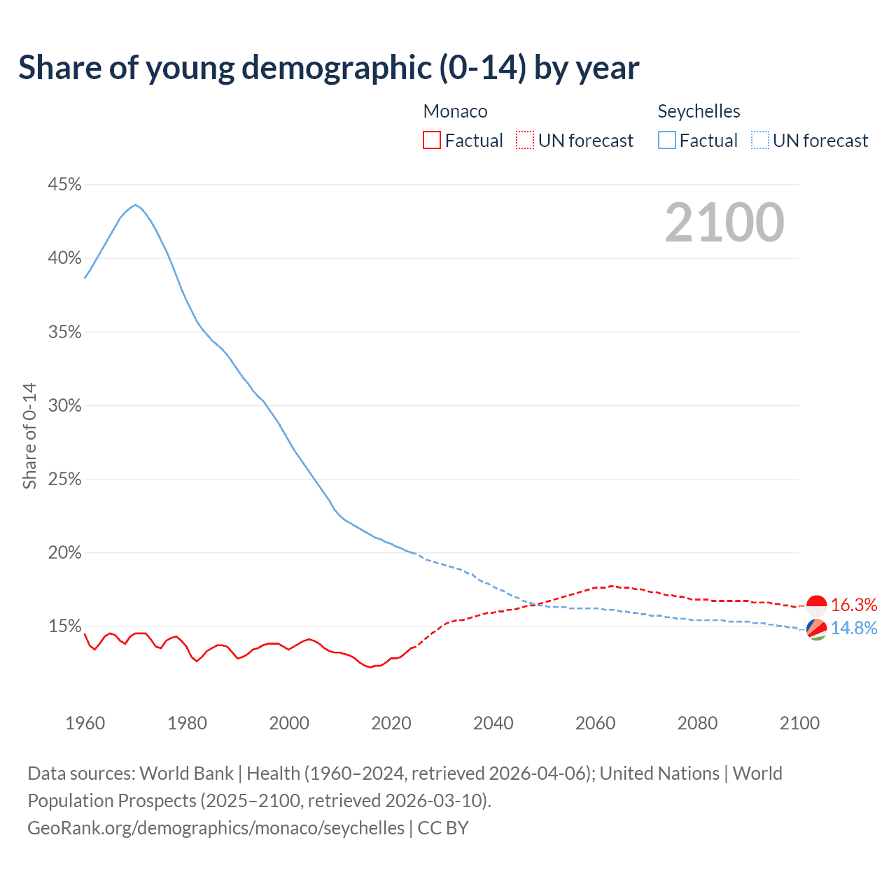 - The share of young demographic (0-15 years old) in Monaco is 13.5% vs 20% in the Seychelles.