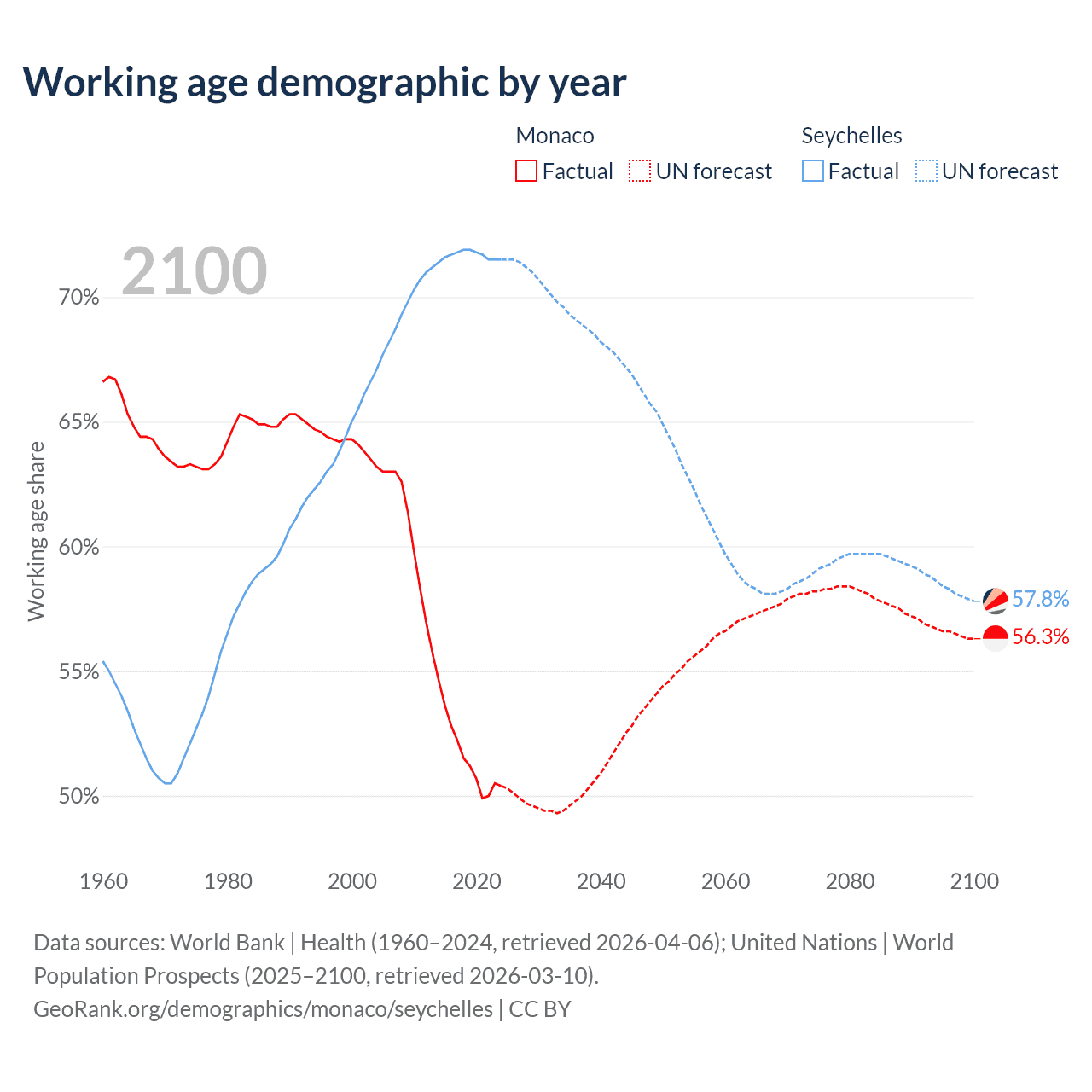 - Monaco has 19.2K working age adults (aged 15-64) vs 90.3K in the Seychelles.