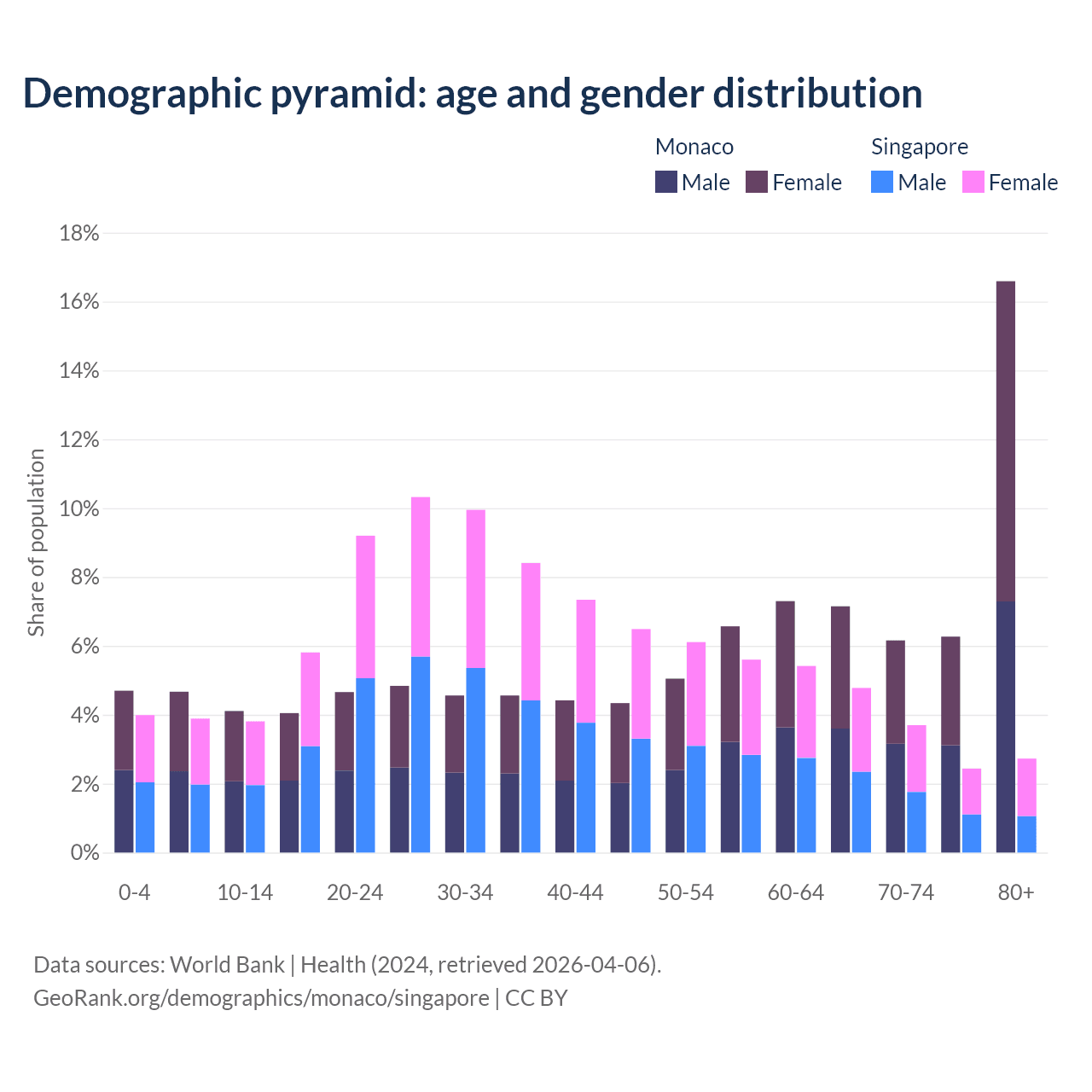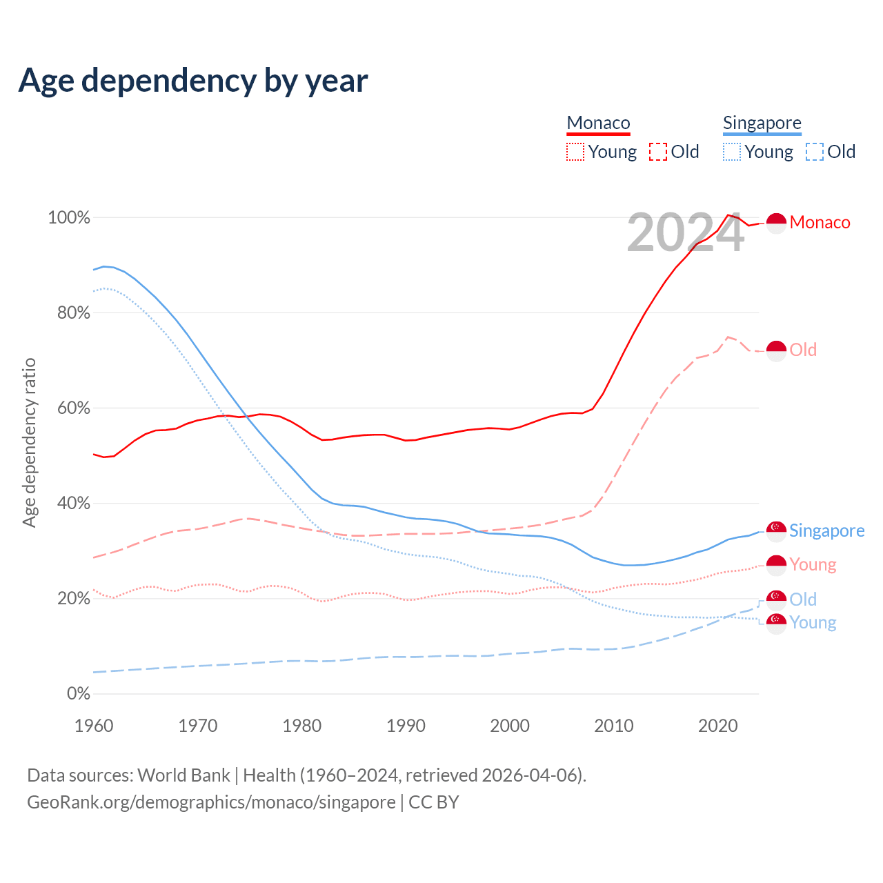 - Monaco is ranked 1/196 by median age (oldest to youngest) vs 68/196 for Singapore.