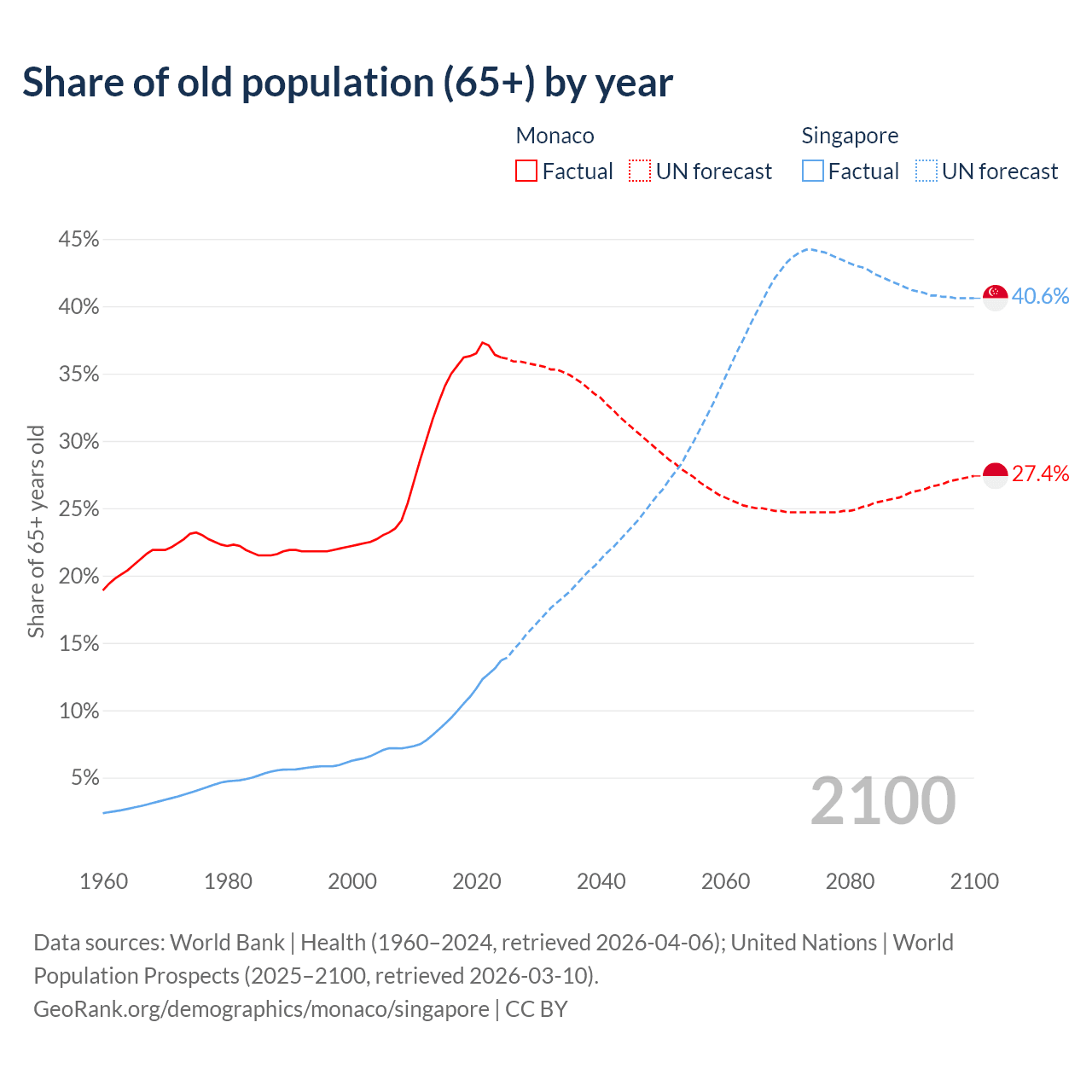 The share of older people aged 65 and over is 36.2% in Monaco and 13.7% in Singapore. Life expectancy in Monaco compared to Singapore .