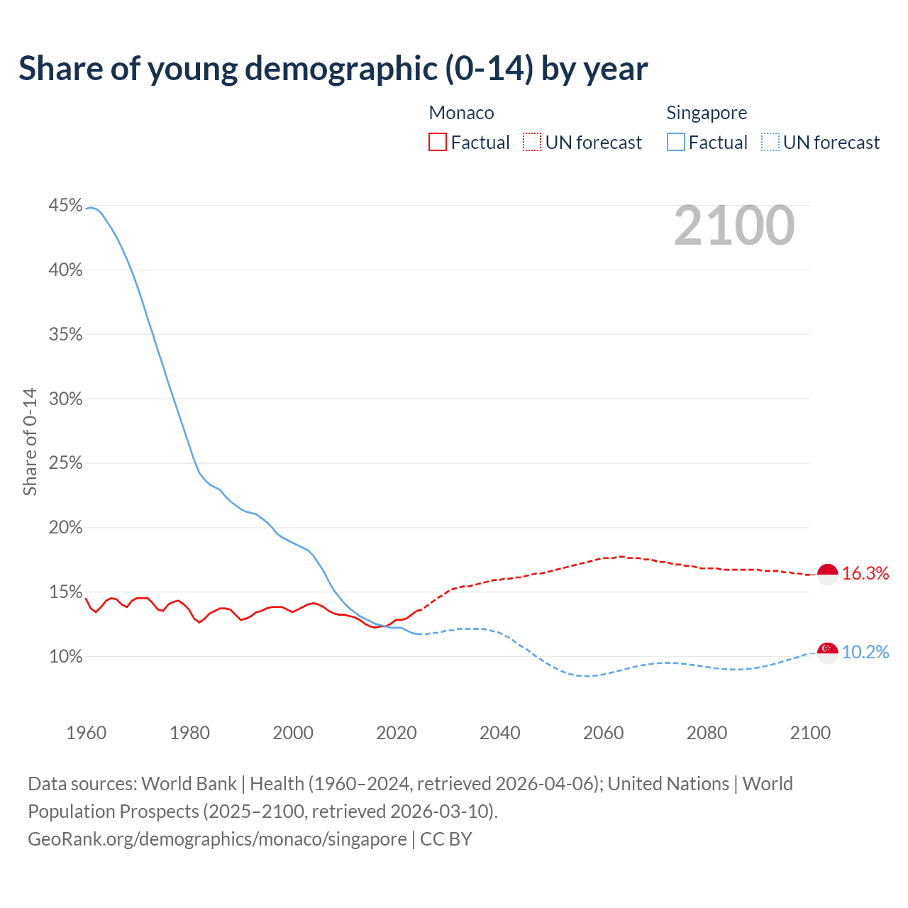 - The share of young demographic (0-15 years old) in Monaco is 13.5% vs 11.7% in Singapore.