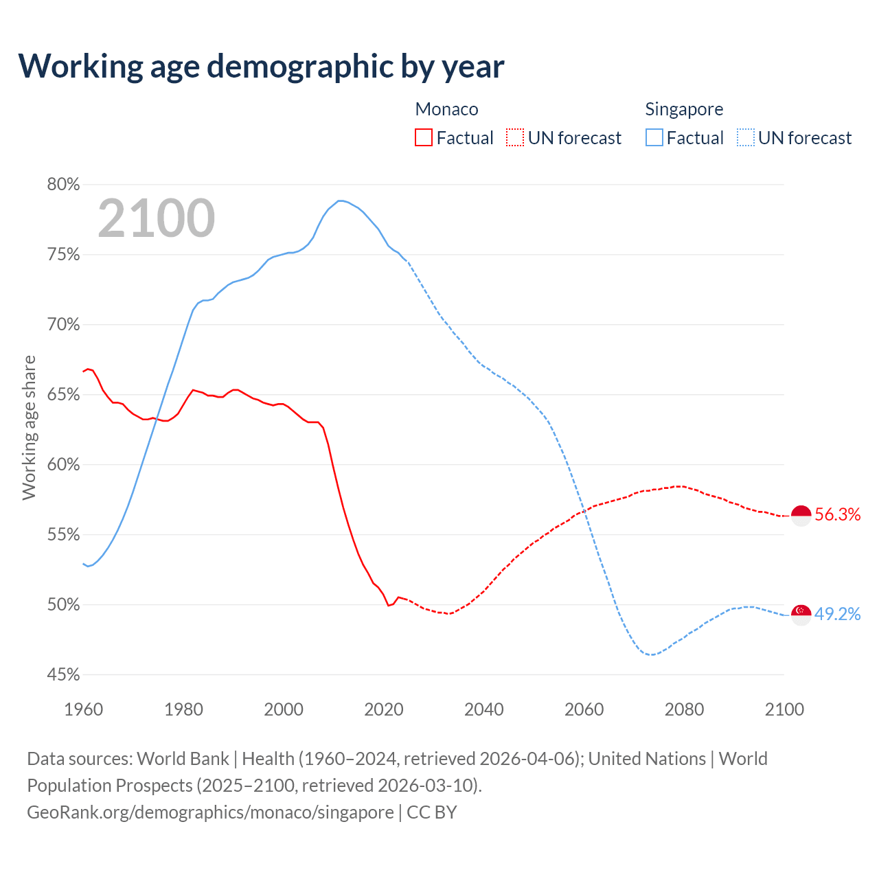 - Monaco has 19.2K working age adults (aged 15-64) vs 4.57M in Singapore.