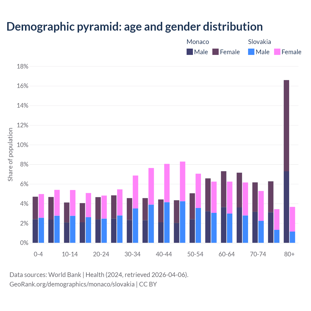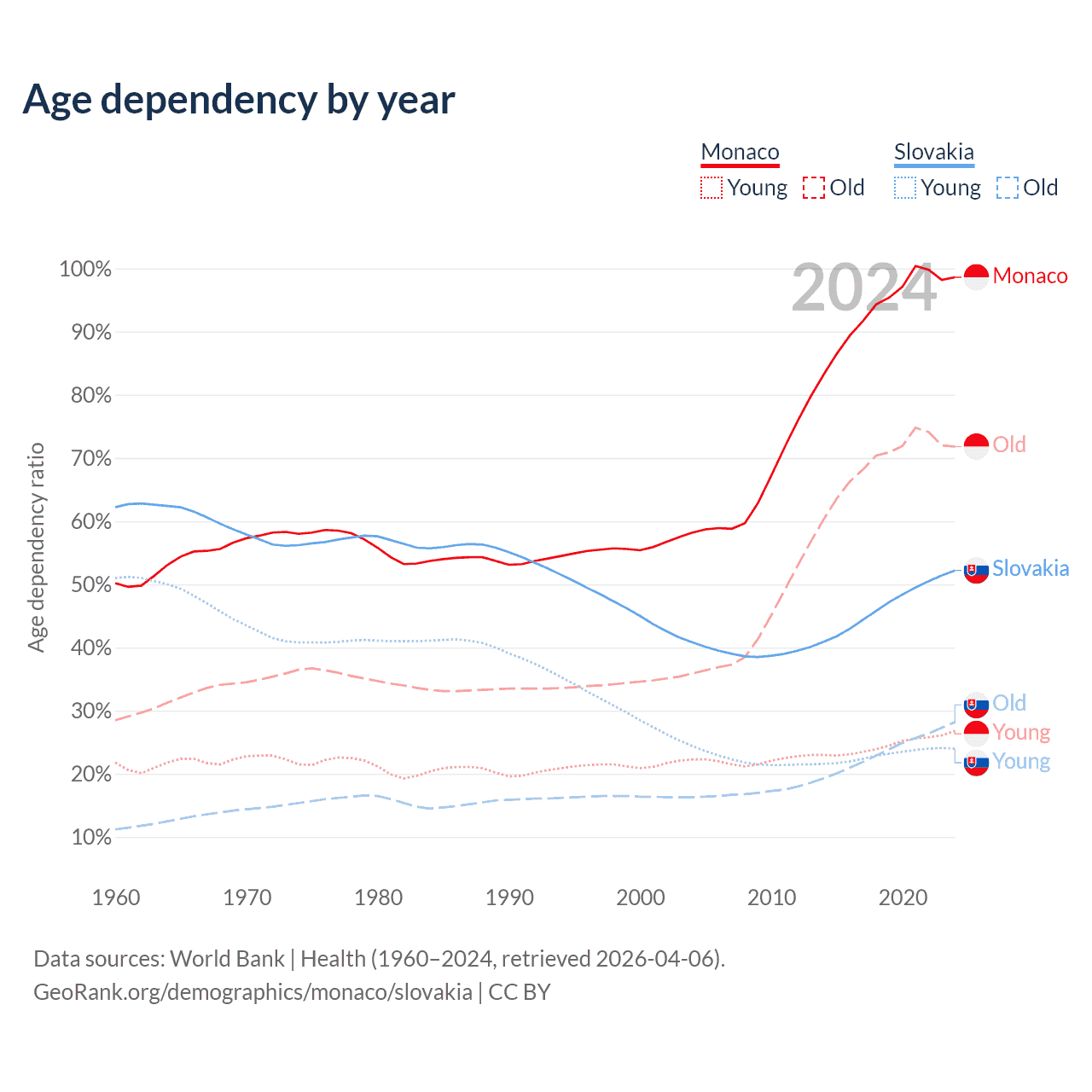 - Monaco is ranked 1/196 by median age (oldest to youngest) vs 31/196 for Slovakia.