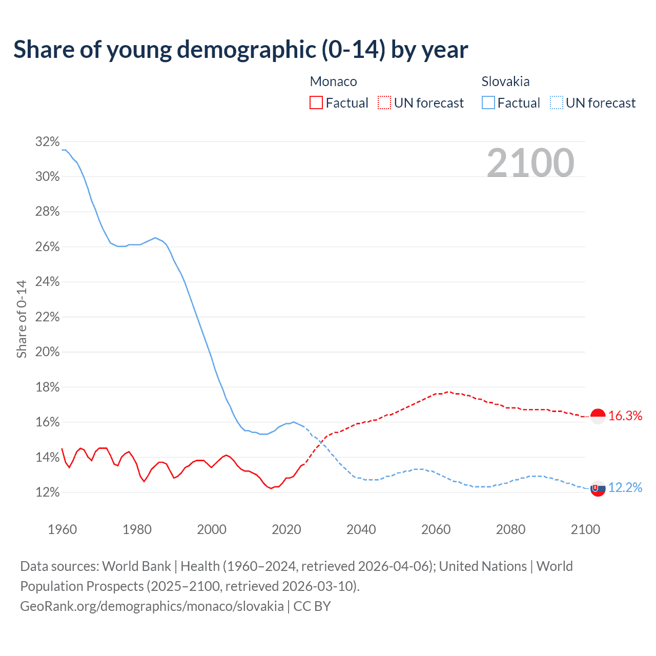 - The share of young demographic (0-15 years old) in Monaco is 13.5% vs 15.8% in Slovakia.