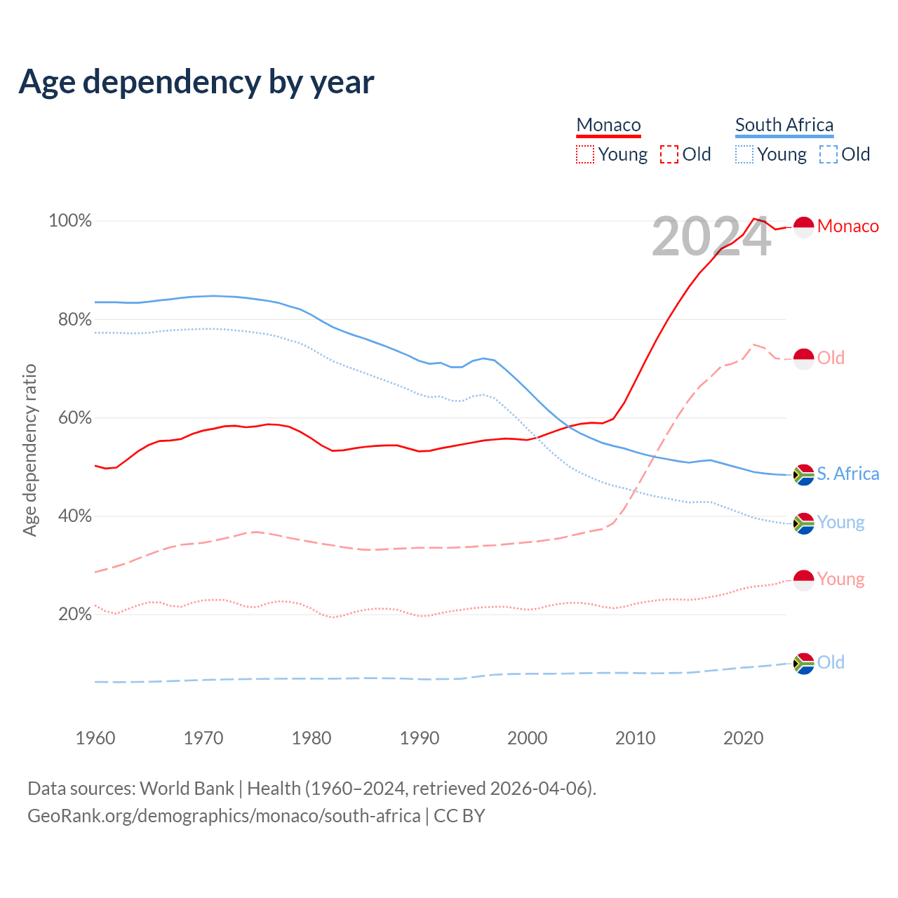 - The share of old-age demographic (65+) in Monaco is 36.2% vs 6.69% in South Africa.