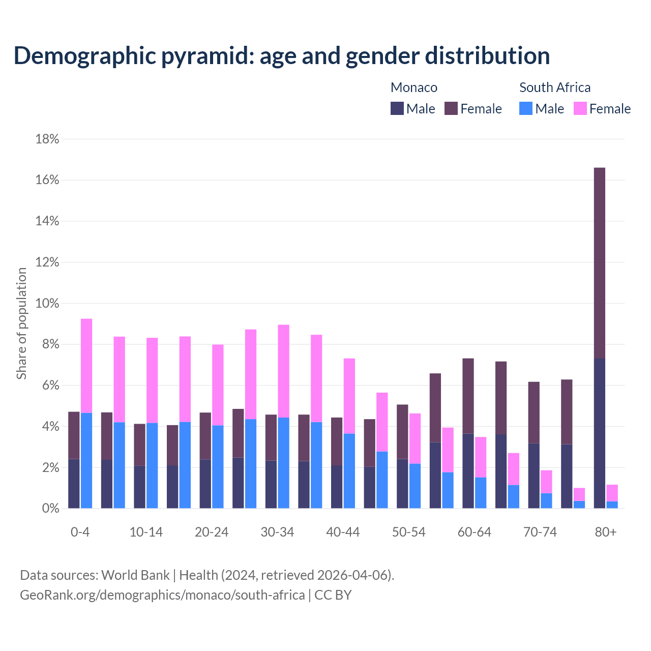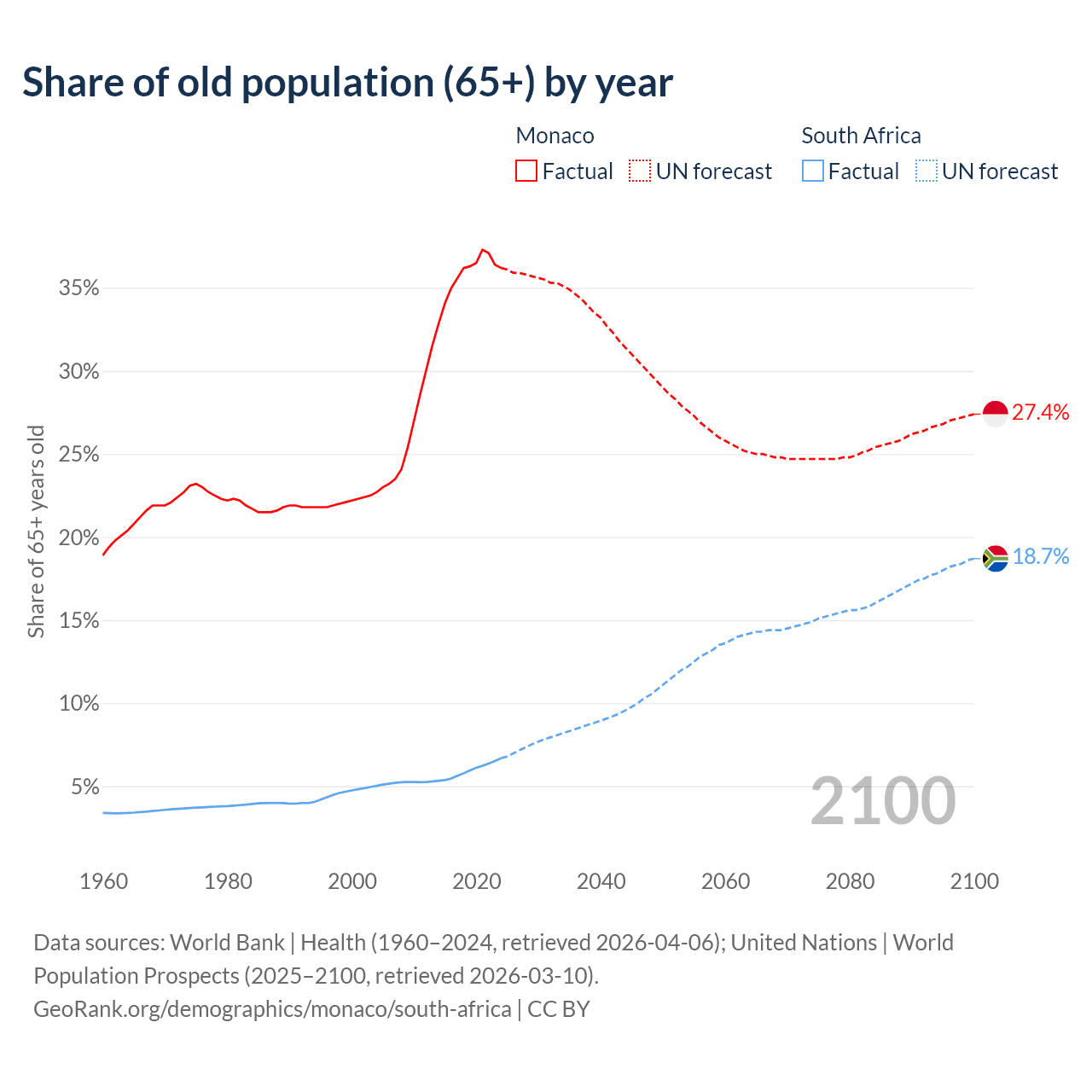 The share of older people aged 65 and over is 36.2% in Monaco and 6.69% in South Africa. Life expectancy in Monaco compared to South Africa .