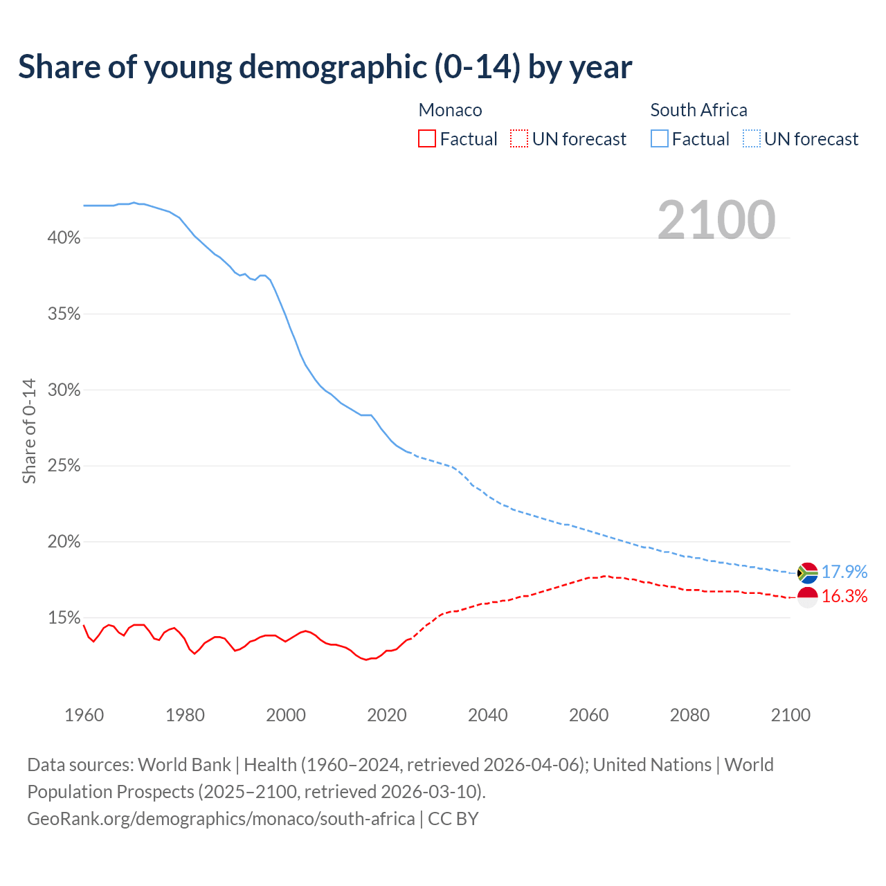 - The share of young demographic (0-15 years old) in Monaco is 13.5% vs 25.9% in South Africa.