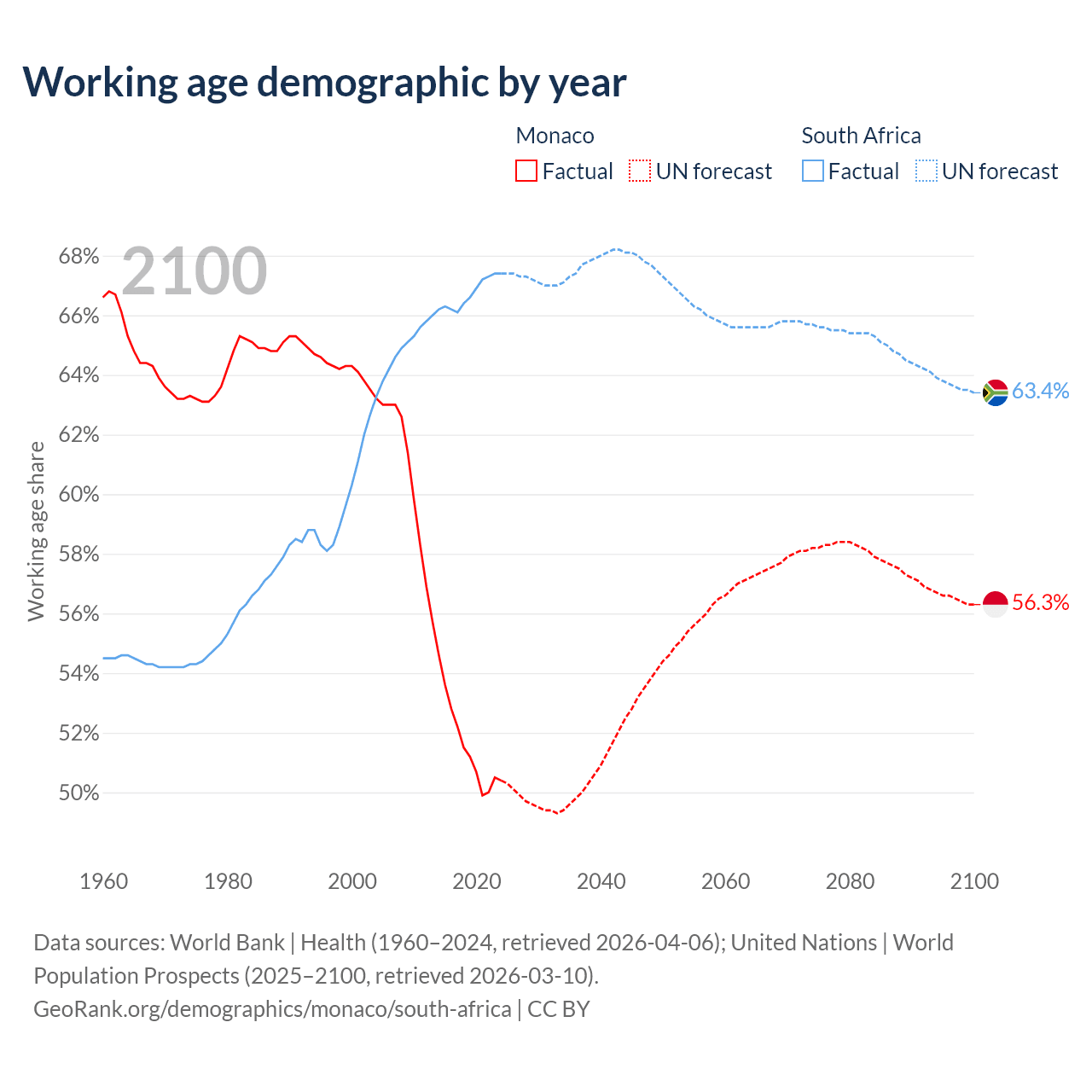 - Monaco has 19.2K working age adults (aged 15-64) vs 44.3M in South Africa.