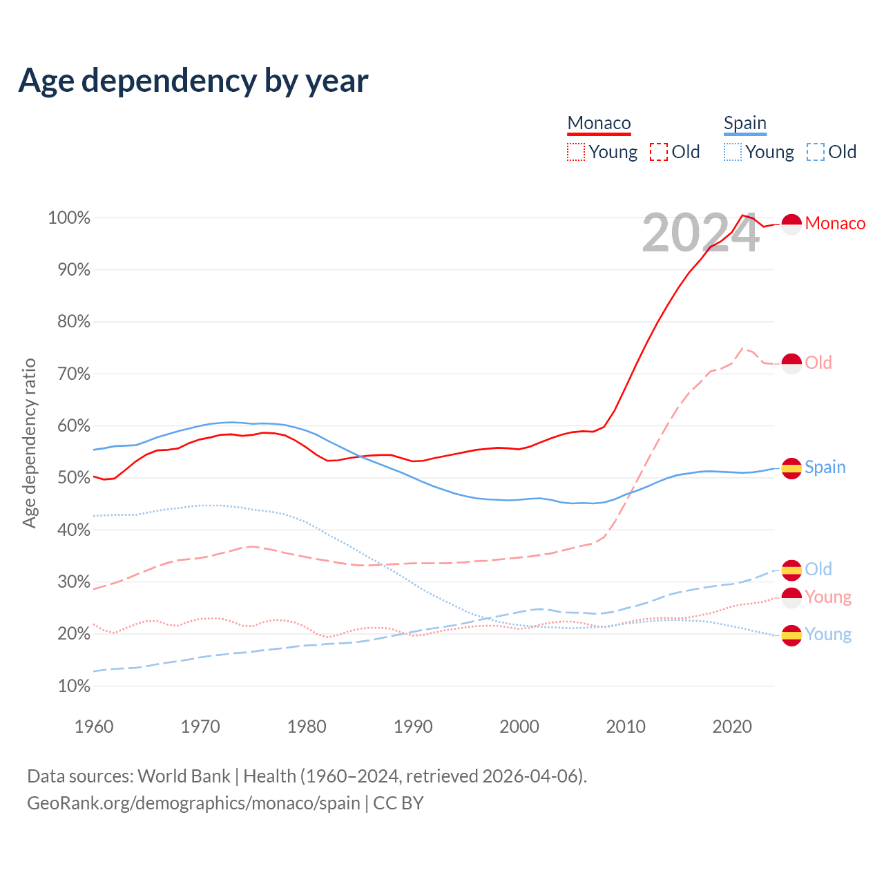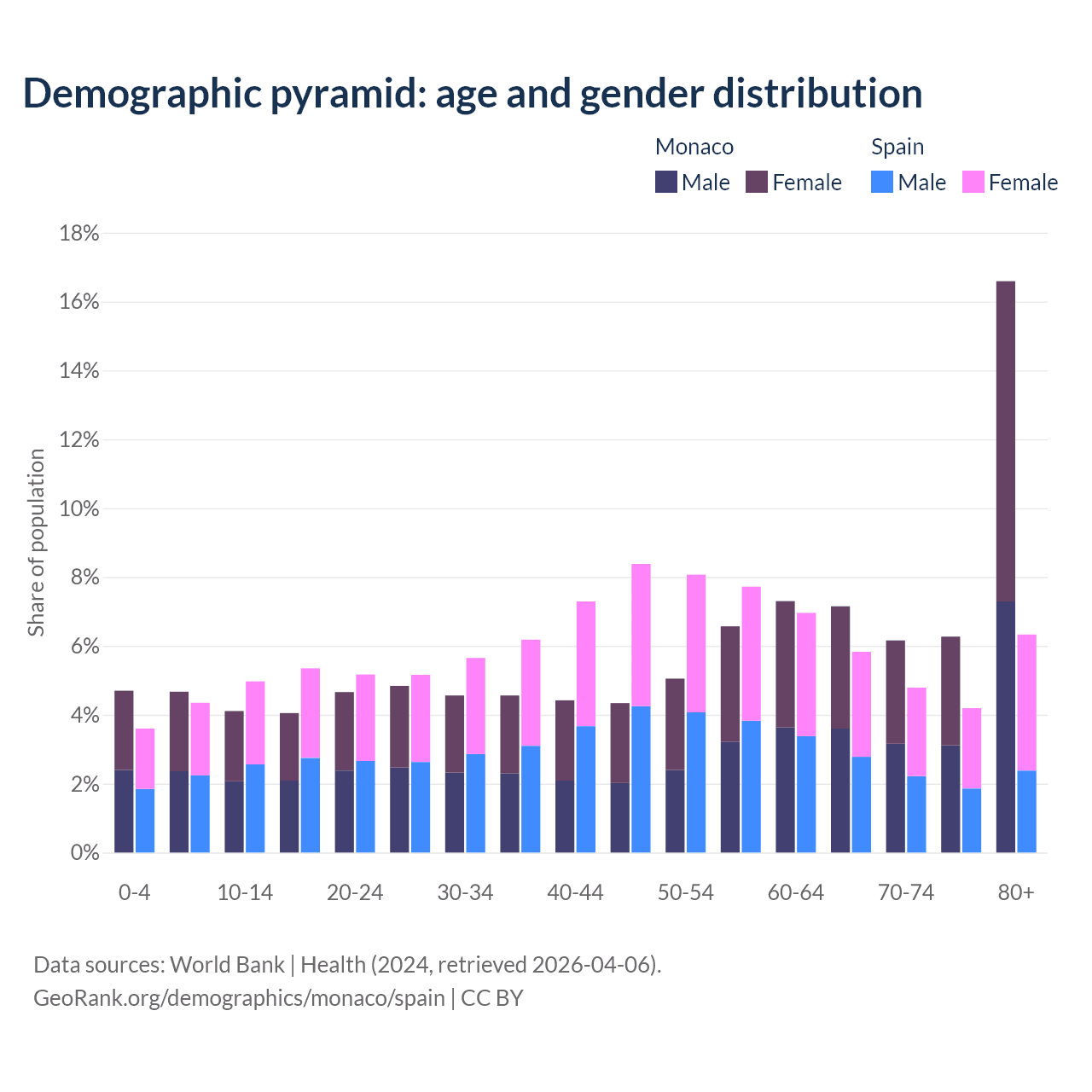 - Monaco is ranked 1/196 by median age (oldest to youngest) vs 7/196 for Spain.