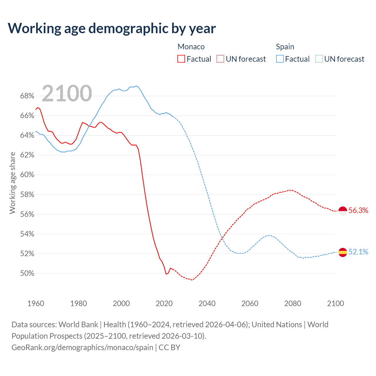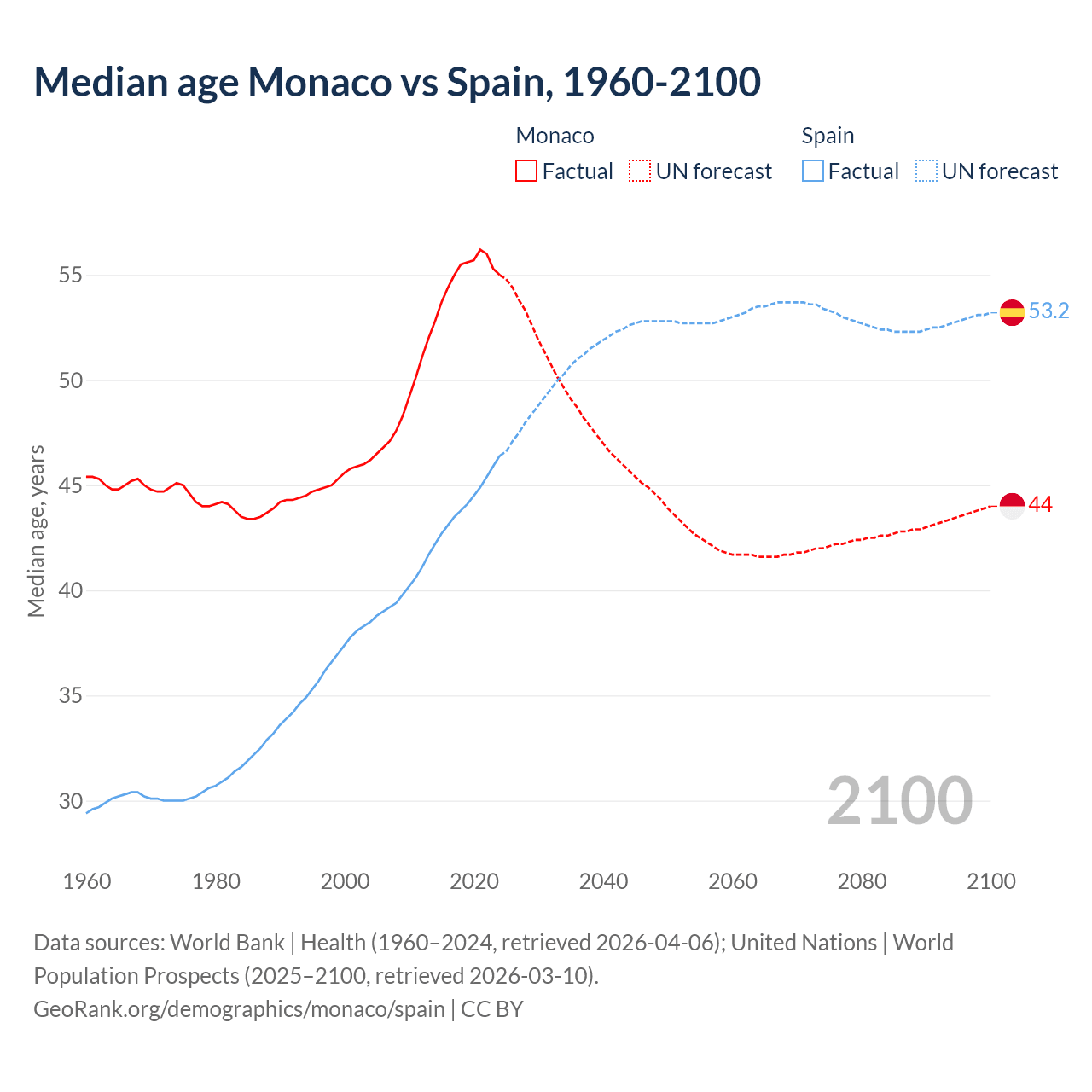 Median age Monaco vs Spain, 1960-2100