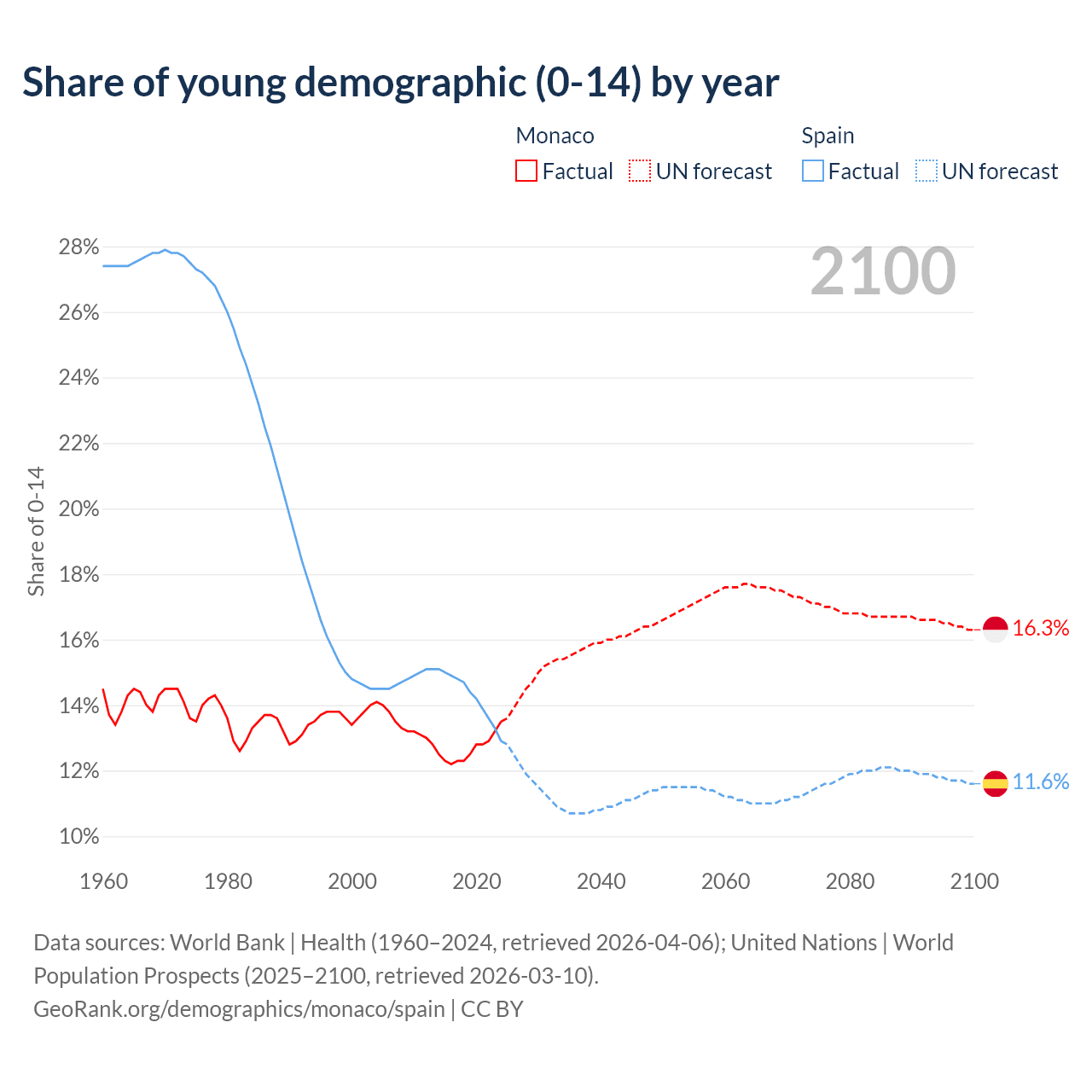 - The share of young demographic (0-15 years old) in Monaco is 13.5% vs 12.9% in Spain.