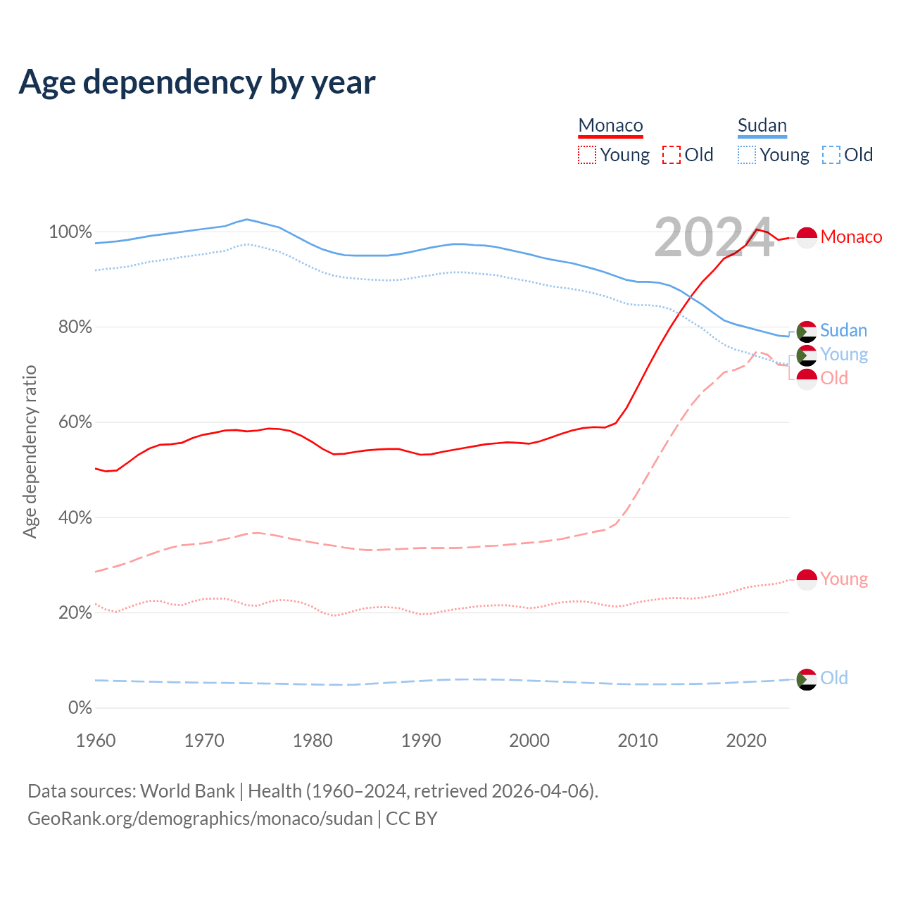 - Monaco is ranked 1/196 by median age (oldest to youngest) vs 172/196 for Sudan.