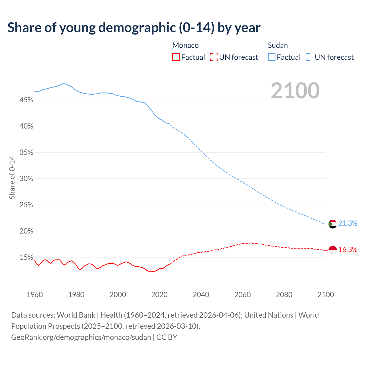 - The share of young demographic (0-15 years old) in Monaco is 13.5% vs 40.5% in Sudan.