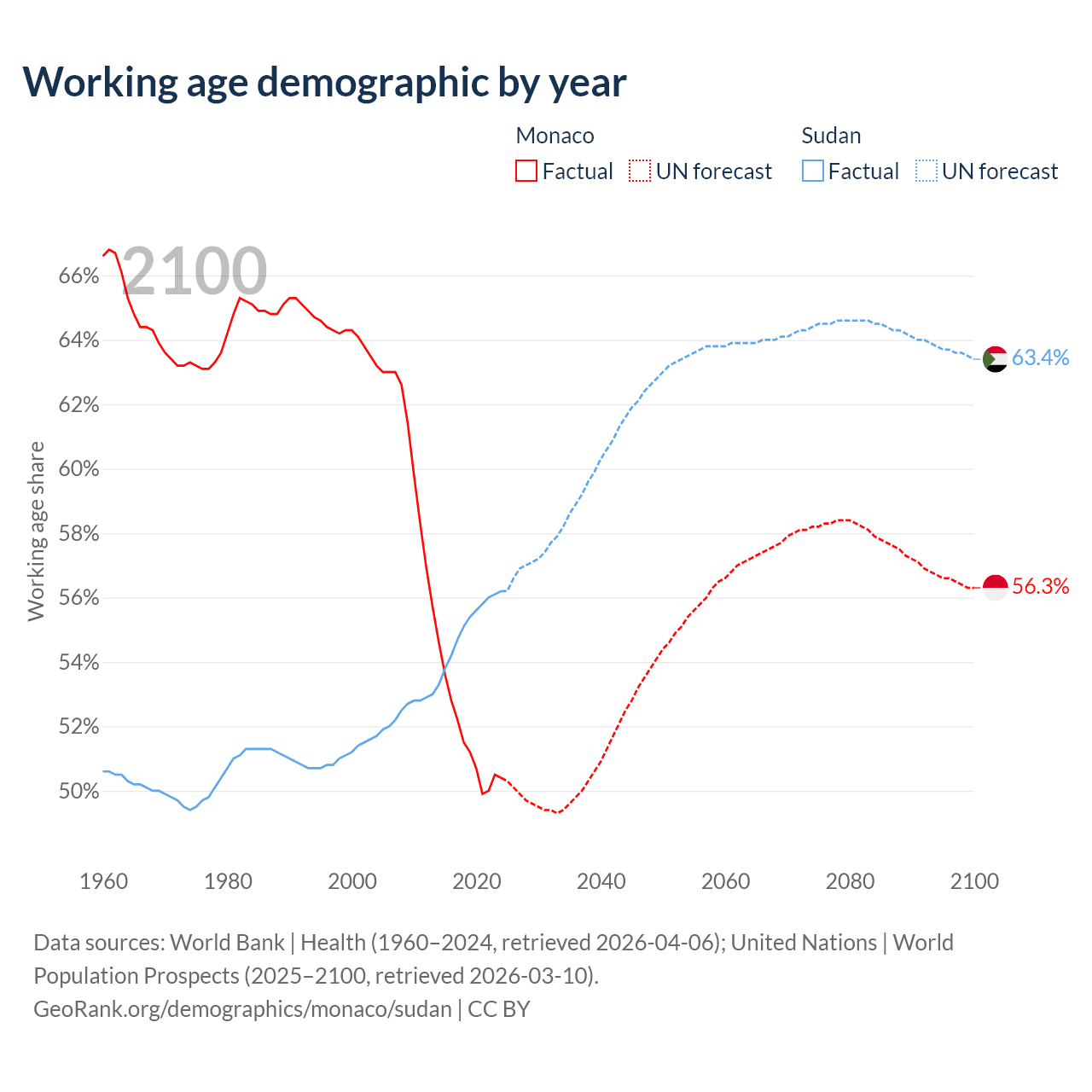 Median age Monaco vs Sudan, 1960-2100