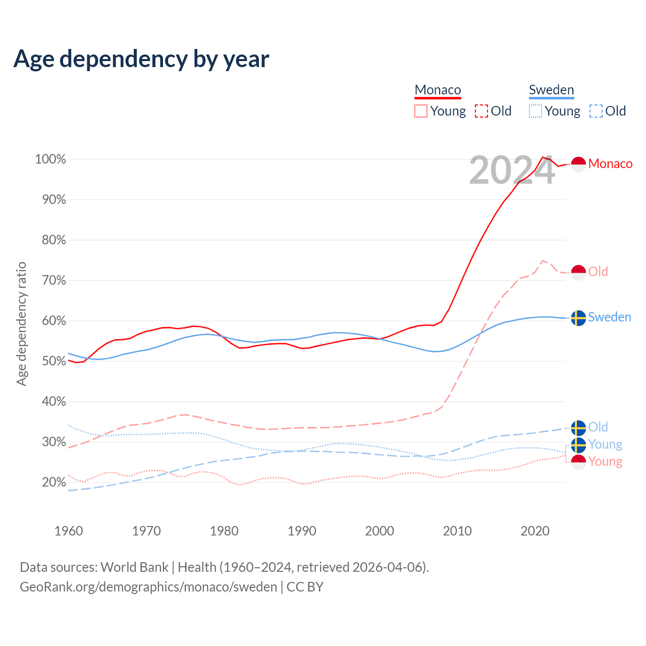 - The share of old-age demographic (65+) in Monaco is 36.2% vs 20.7% in Sweden.