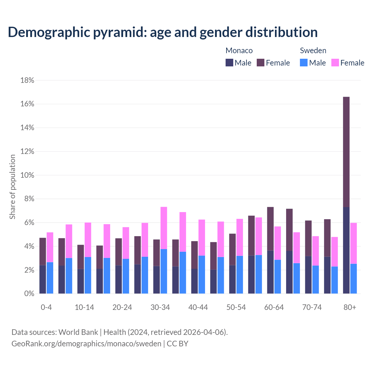 - Monaco is ranked 1/196 by median age (oldest to youngest) vs 39/196 for Sweden.