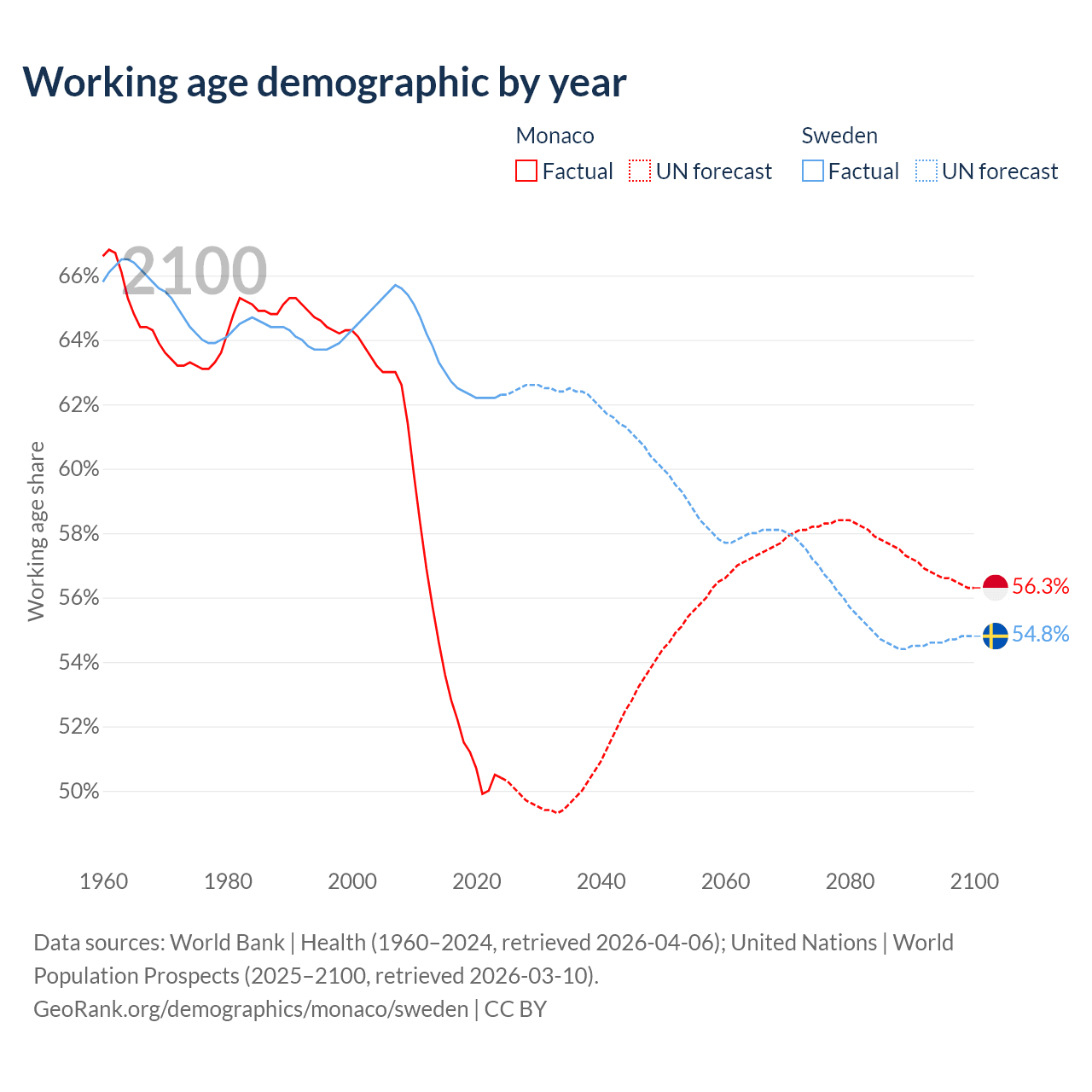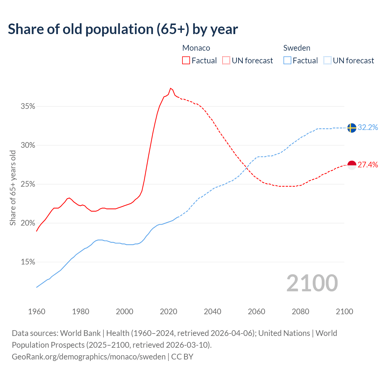Median age Monaco vs Sweden, 1960-2100