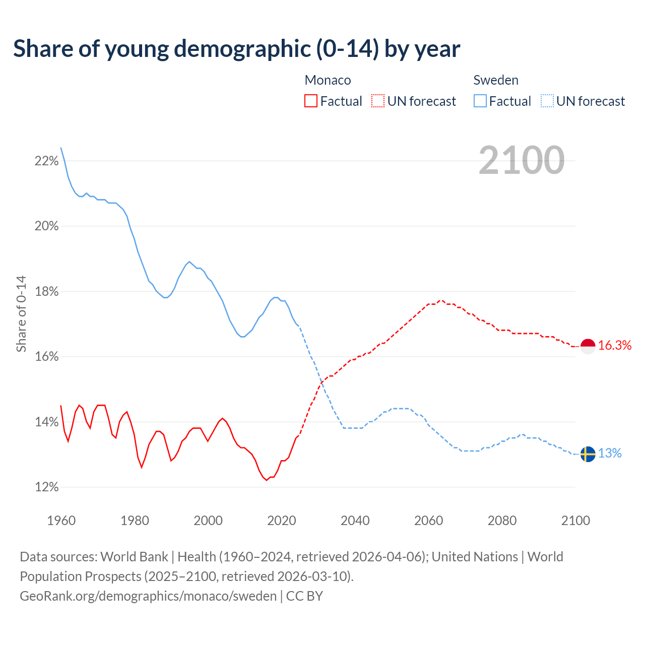 - The share of young demographic (0-15 years old) in Monaco is 13.5% vs 17% in Sweden.