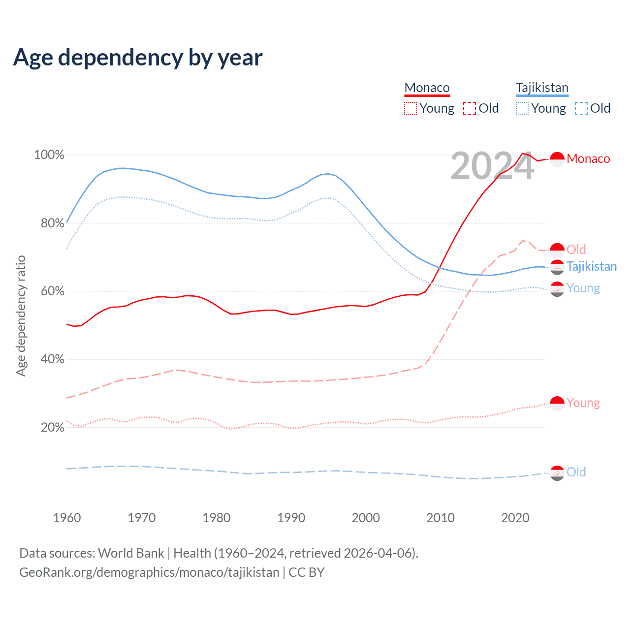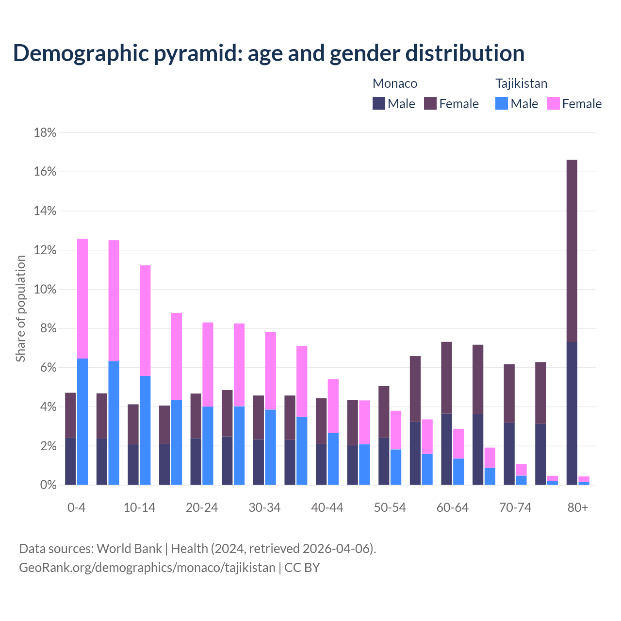 - Monaco is ranked 1/196 by median age (oldest to youngest) vs 142/196 for Tajikistan.