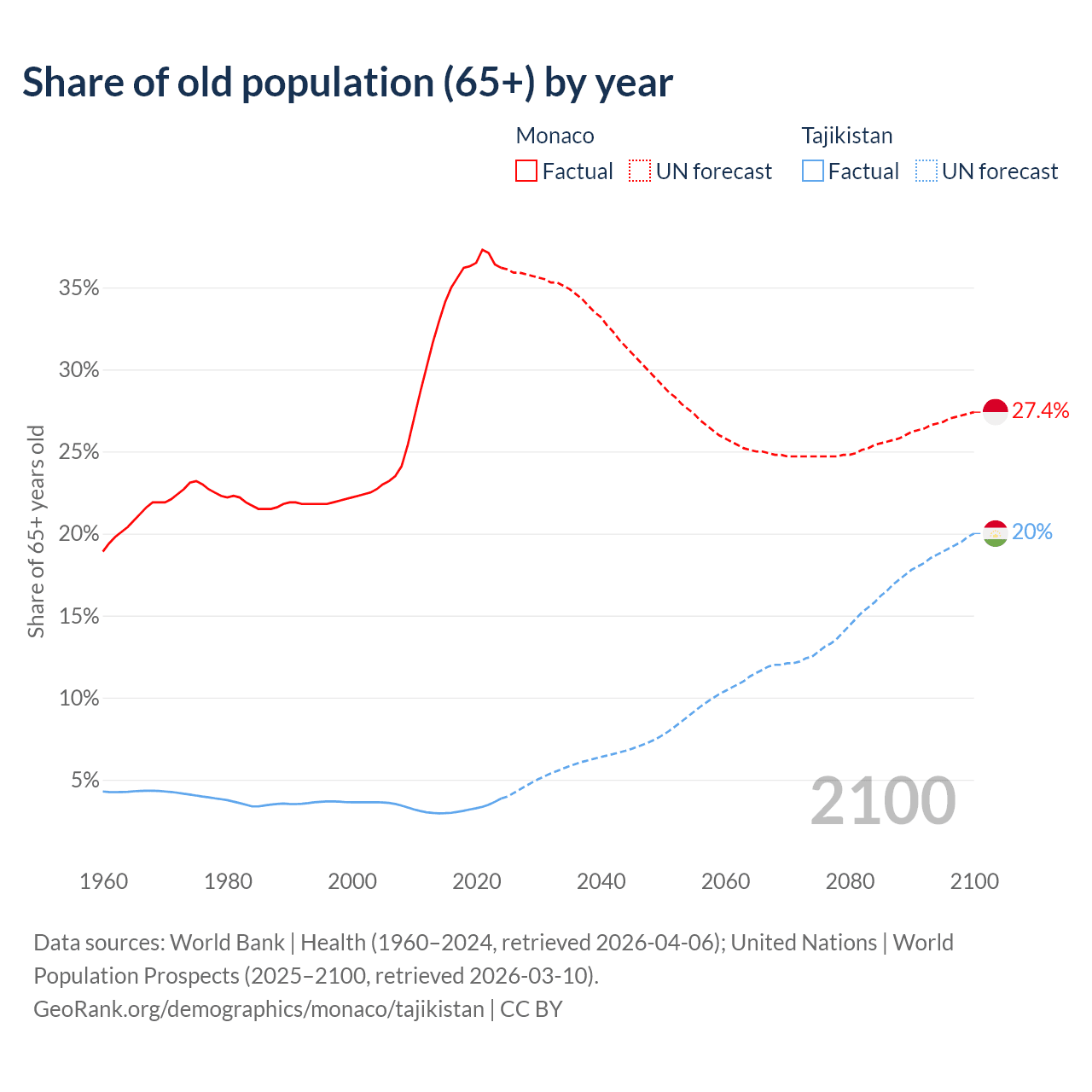 The share of older people aged 65 and over is 36.2% in Monaco and 3.85% in Tajikistan. Life expectancy in Monaco compared to Tajikistan .