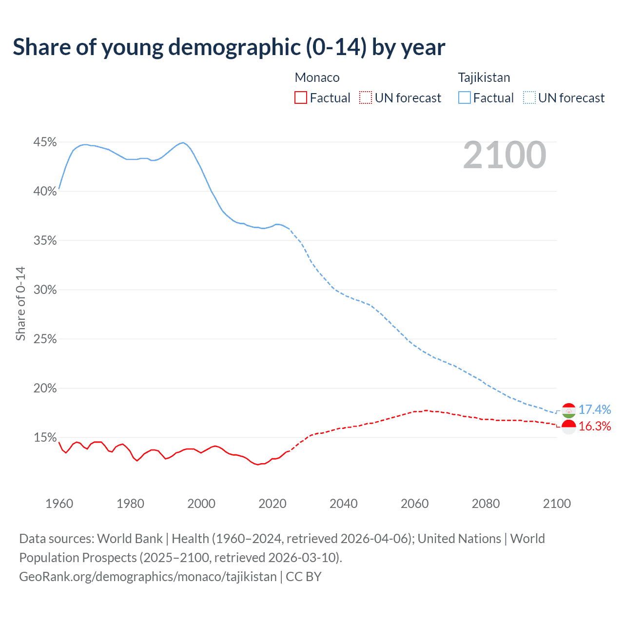 - The share of young demographic (0-15 years old) in Monaco is 13.5% vs 36.3% in Tajikistan.