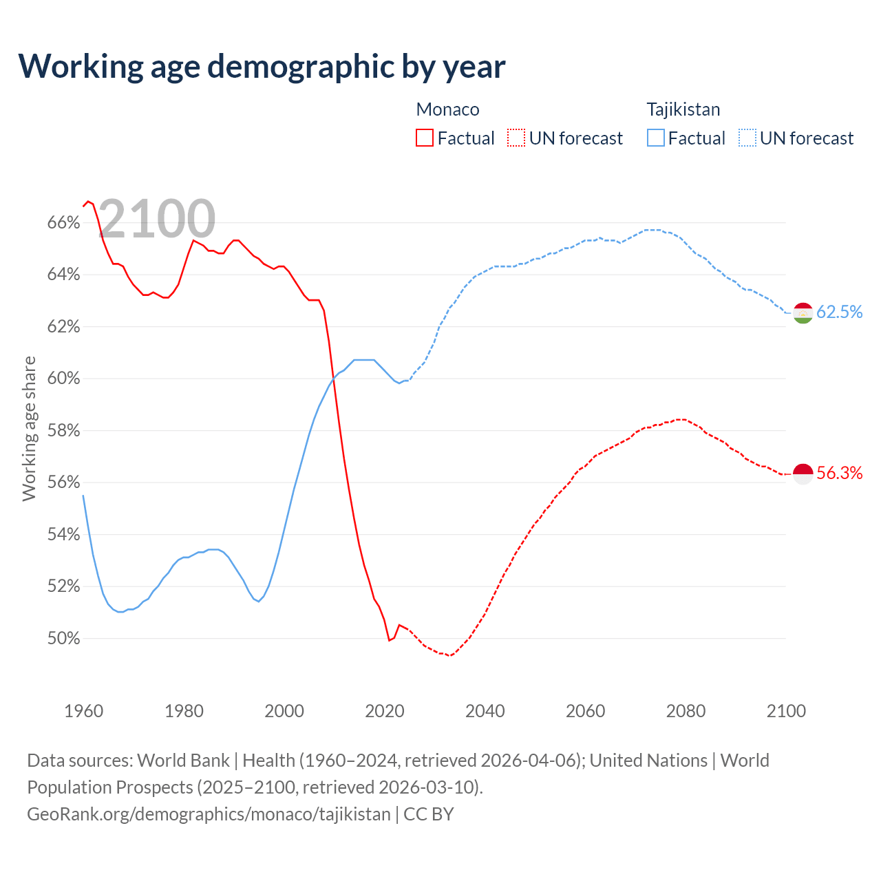 - Monaco has 19.2K working age adults (aged 15-64) vs 6.61M in Tajikistan.