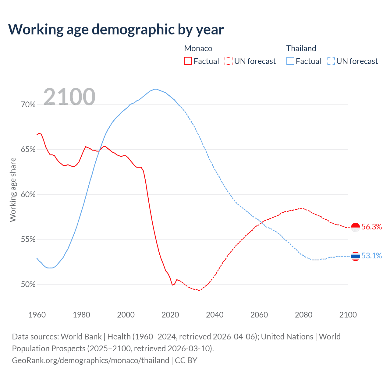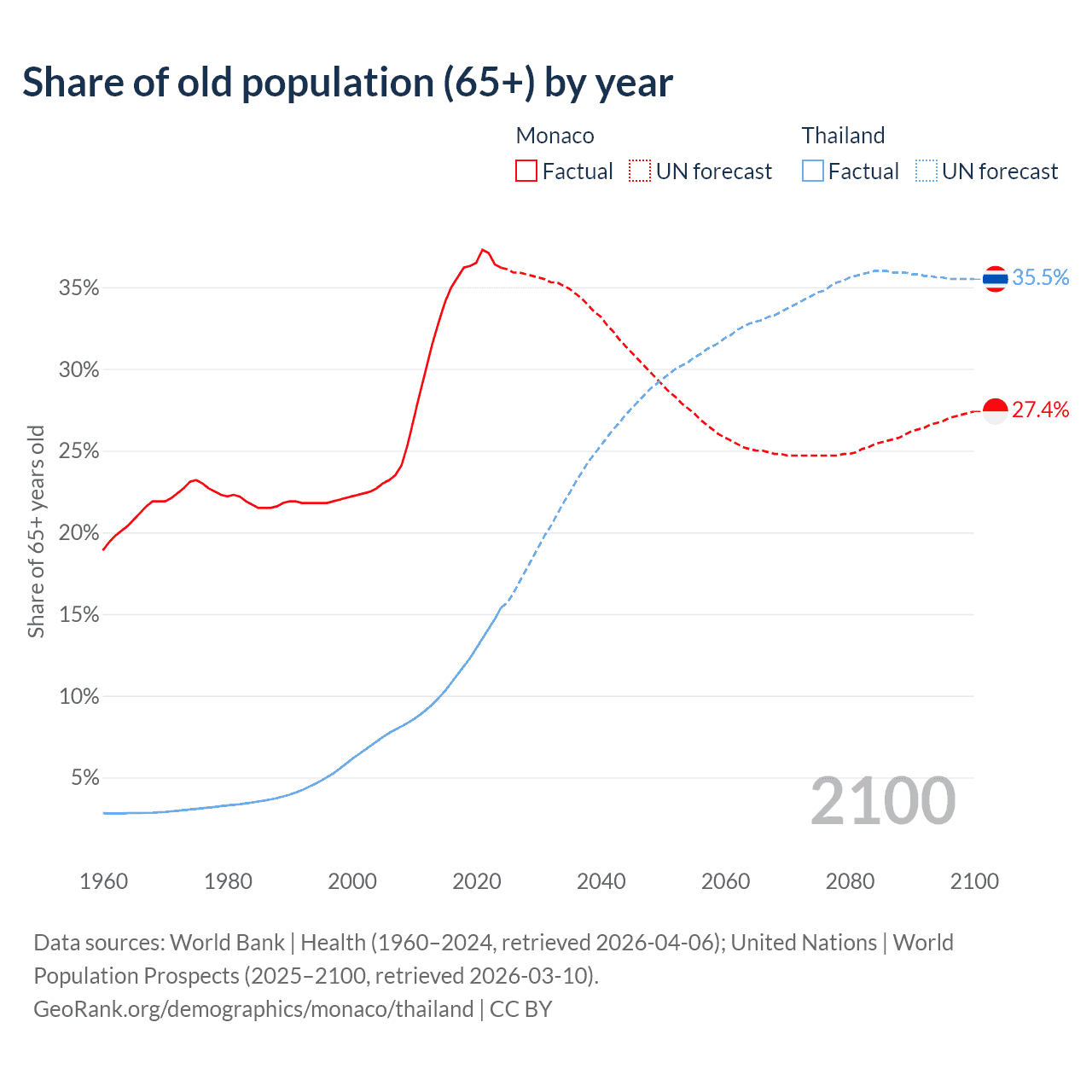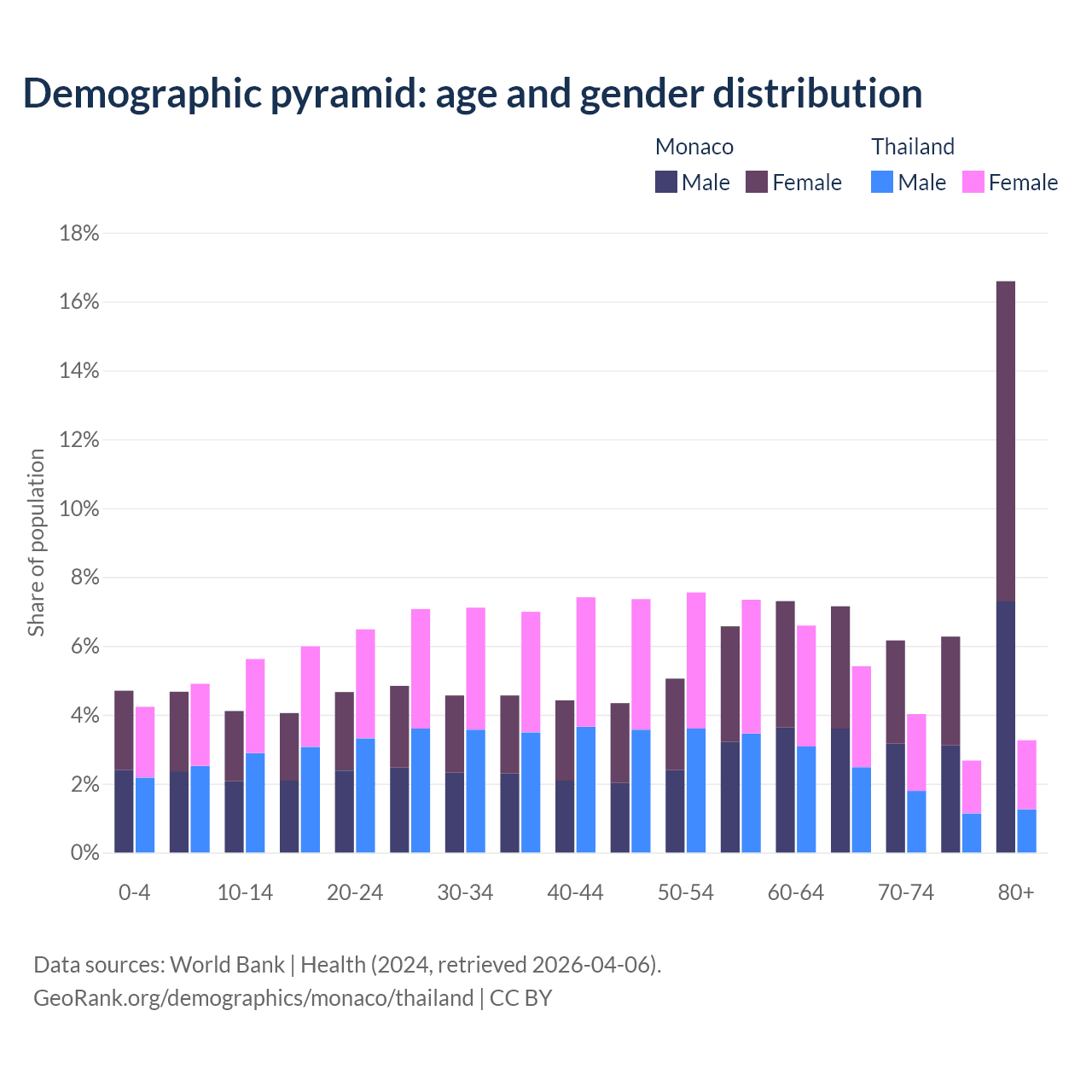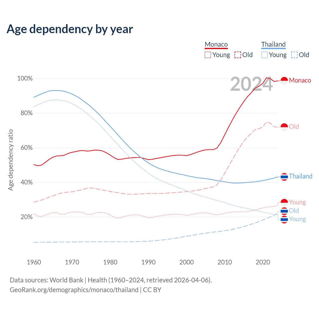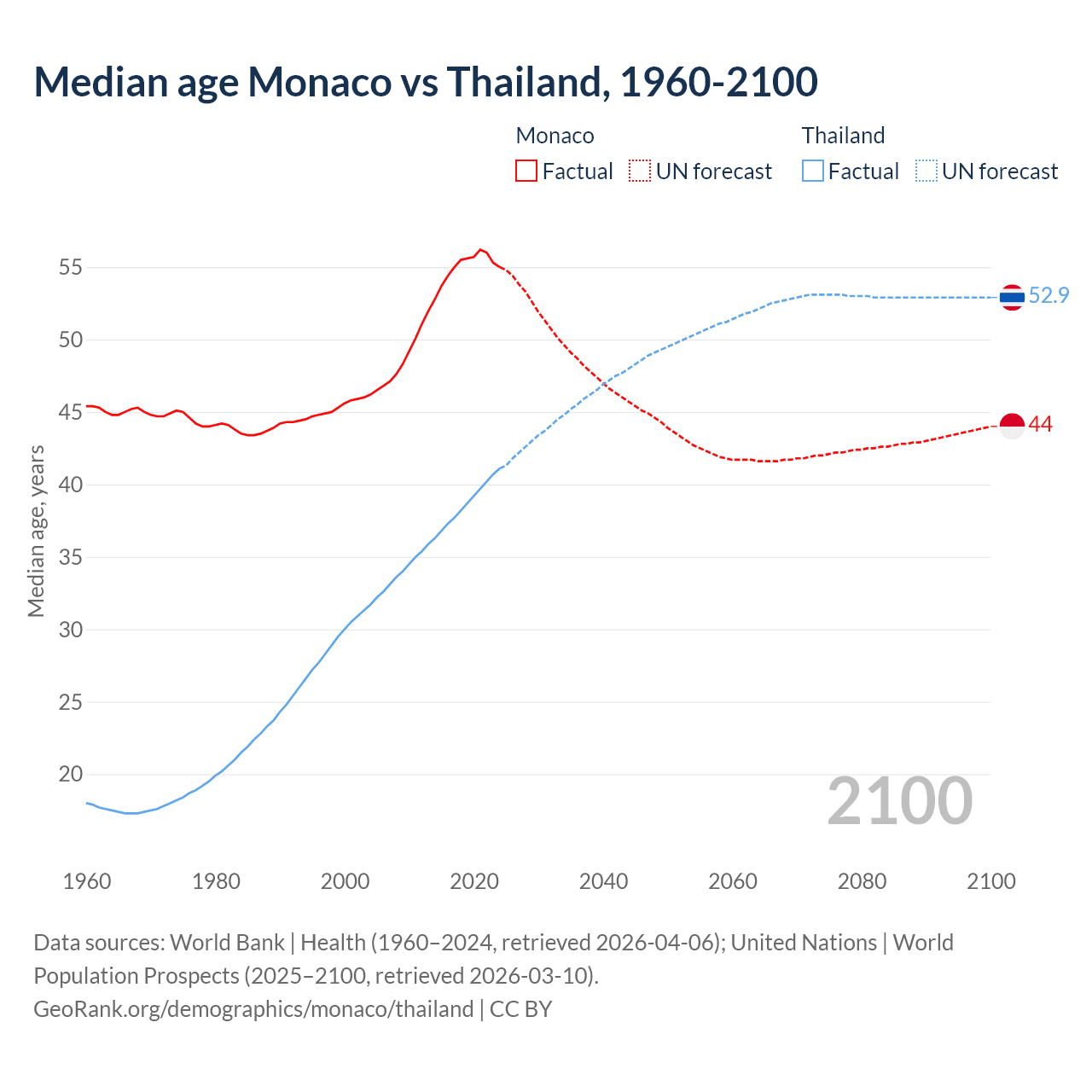 - Monaco is ranked 1/196 by median age (oldest to youngest) vs 40/196 for Thailand.