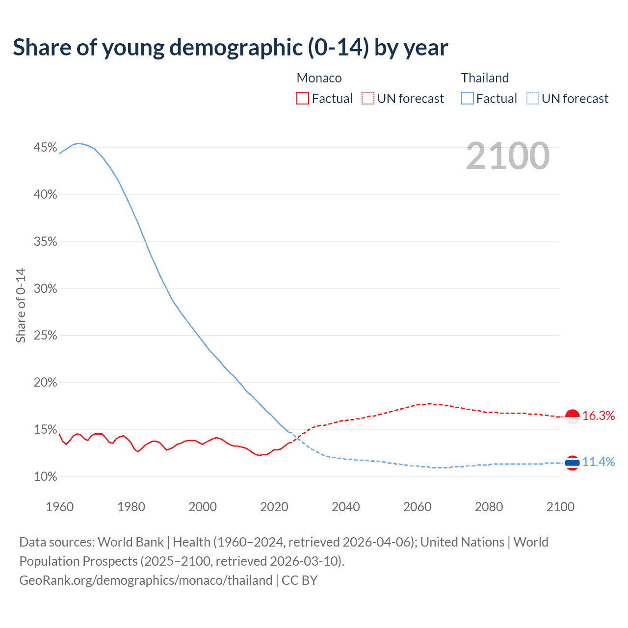 - The share of young demographic (0-15 years old) in Monaco is 13.5% vs 14.7% in Thailand.