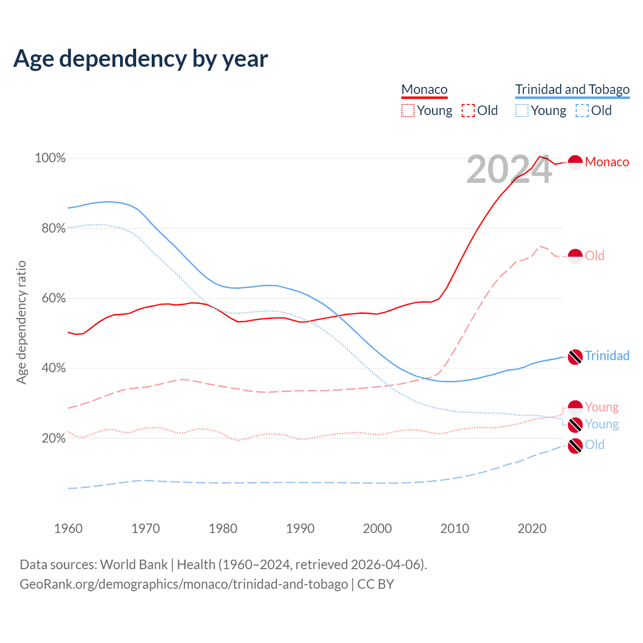 - The share of old-age demographic (65+) in Monaco is 36.2% vs 12.4% in Trinidad and Tobago.