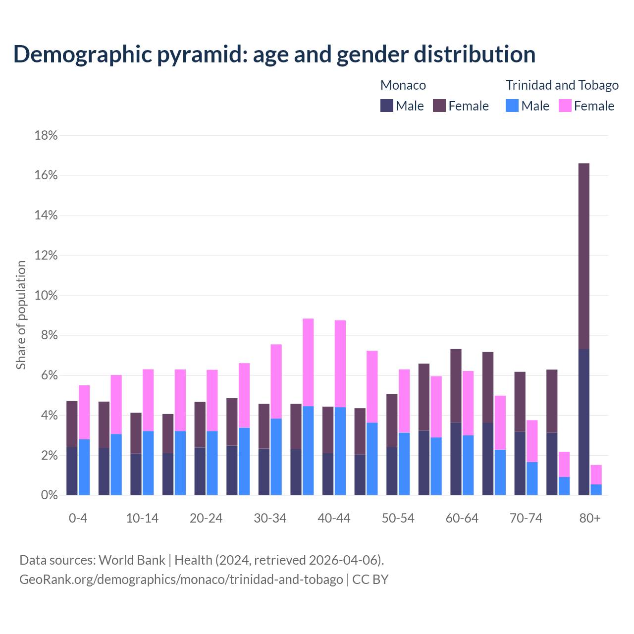 - Monaco is ranked 1/196 by median age (oldest to youngest) vs 58/196 for Trinidad and Tobago.
