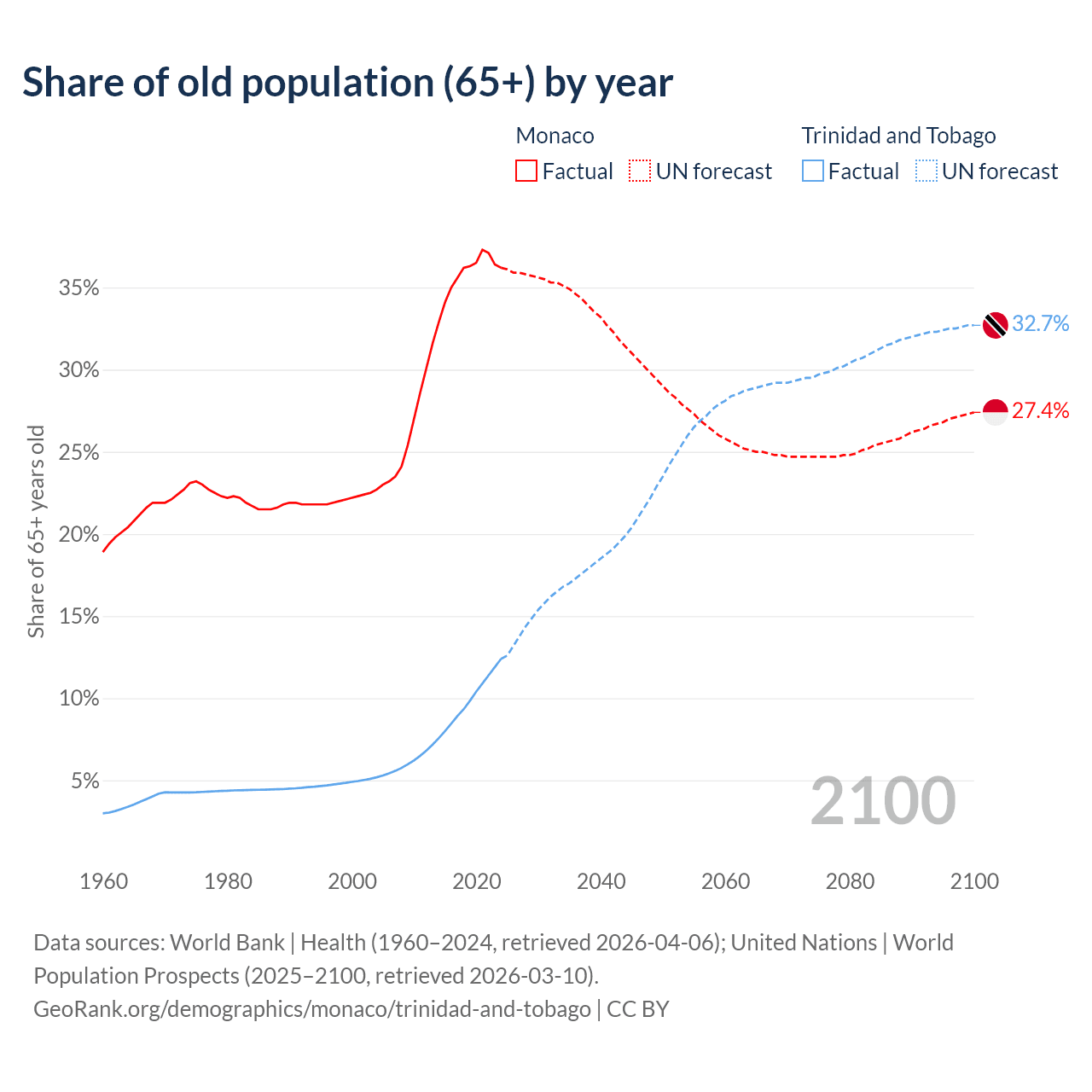 The share of older people aged 65 and over is 36.2% in Monaco and 12.4% in Trinidad and Tobago. Life expectancy in Monaco compared to Trinidad and Tobago .