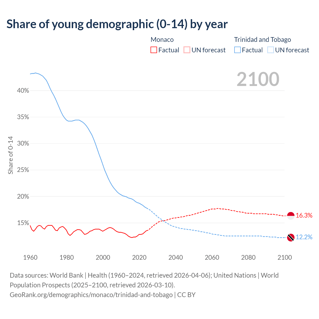 - The share of young demographic (0-15 years old) in Monaco is 13.5% vs 17.8% in Trinidad and Tobago.