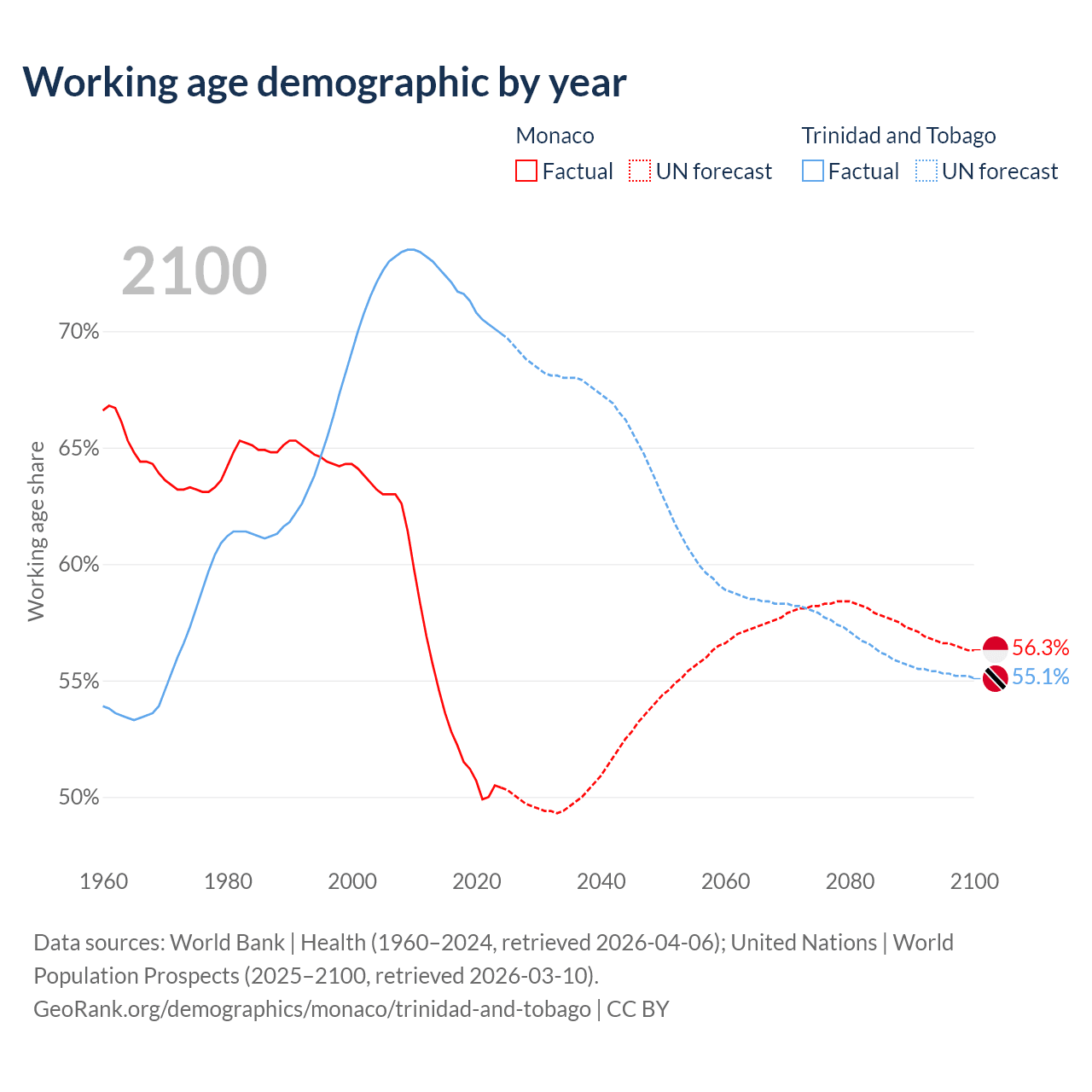 - Monaco has 19.2K working age adults (aged 15-64) vs 960K in Trinidad and Tobago.