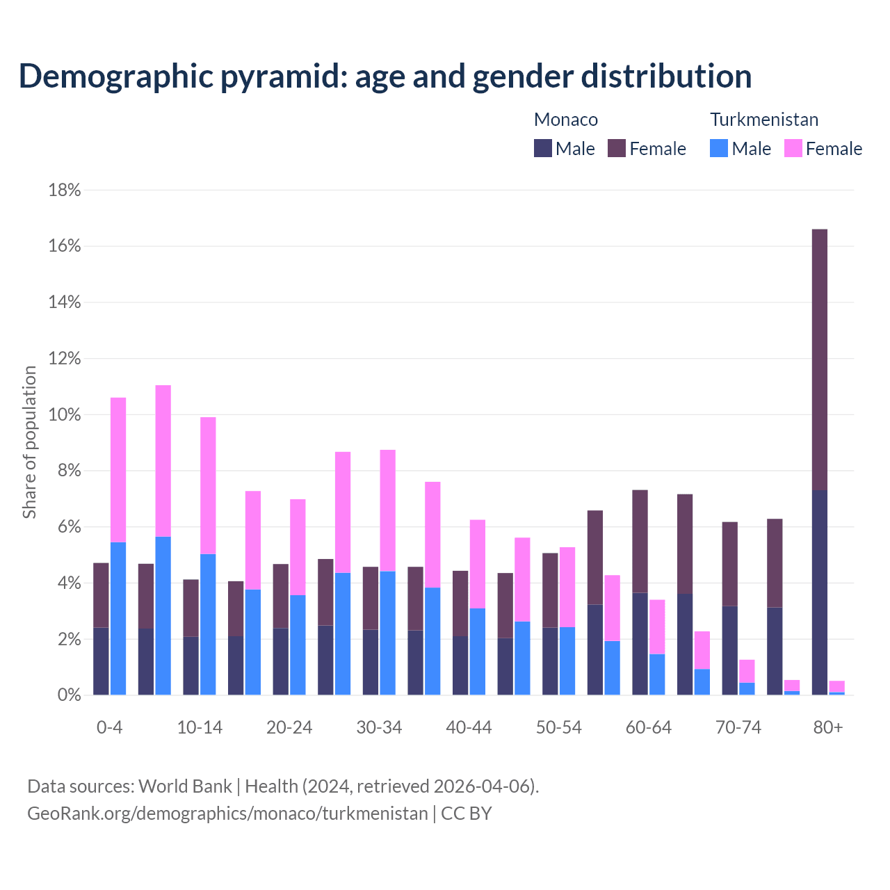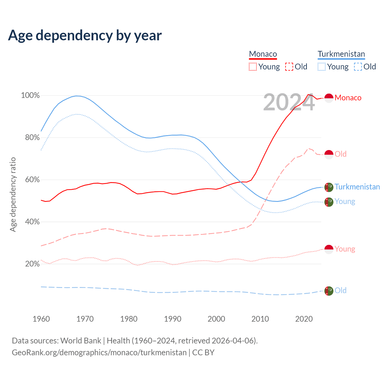 - Monaco is ranked 1/196 by median age (oldest to youngest) vs 119/196 for Turkmenistan.
