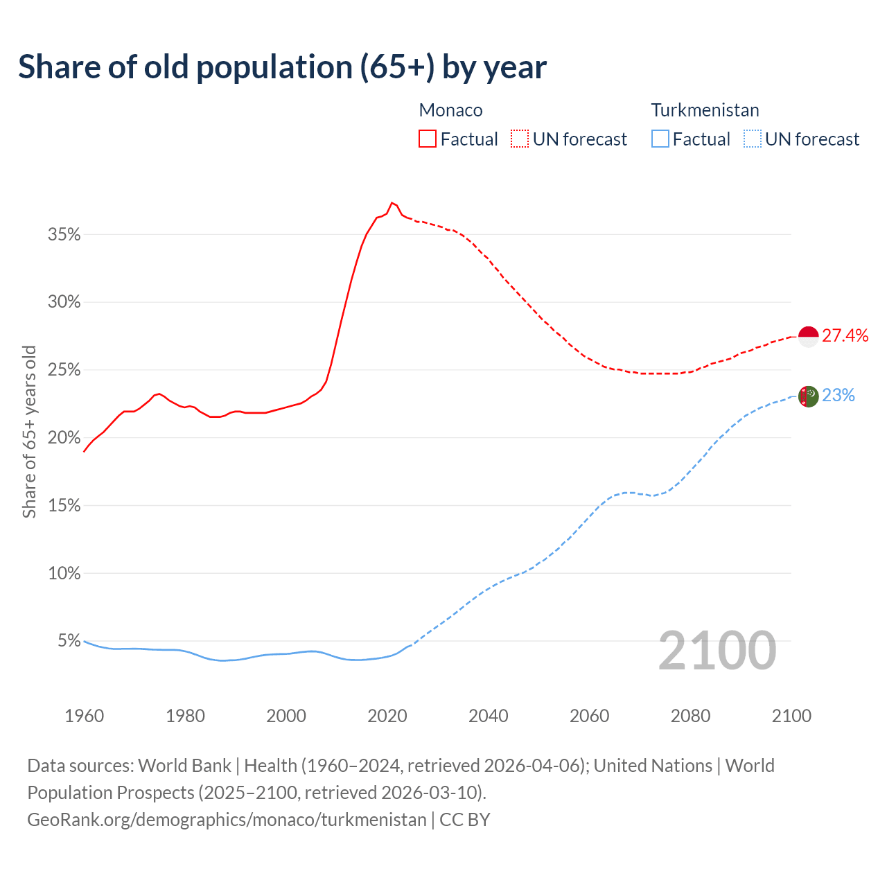 - The share of old-age demographic (65+) in Monaco is 36.2% vs 4.53% in Turkmenistan.