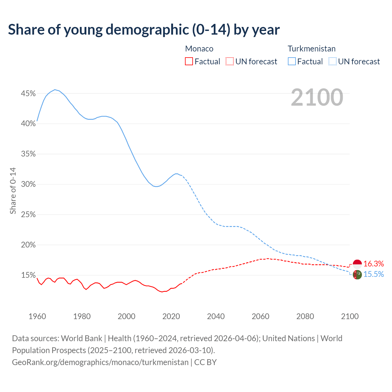 - The share of young demographic (0-15 years old) in Monaco is 13.5% vs 31.5% in Turkmenistan.