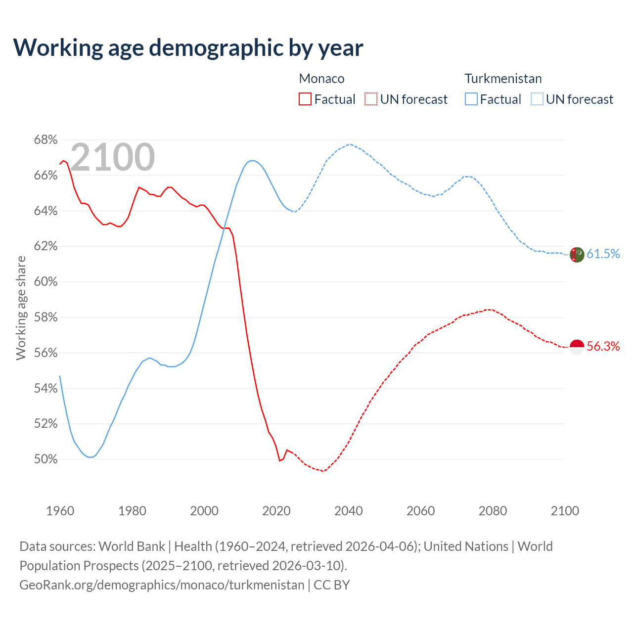 - Monaco has 19.2K working age adults (aged 15-64) vs 4.97M in Turkmenistan.