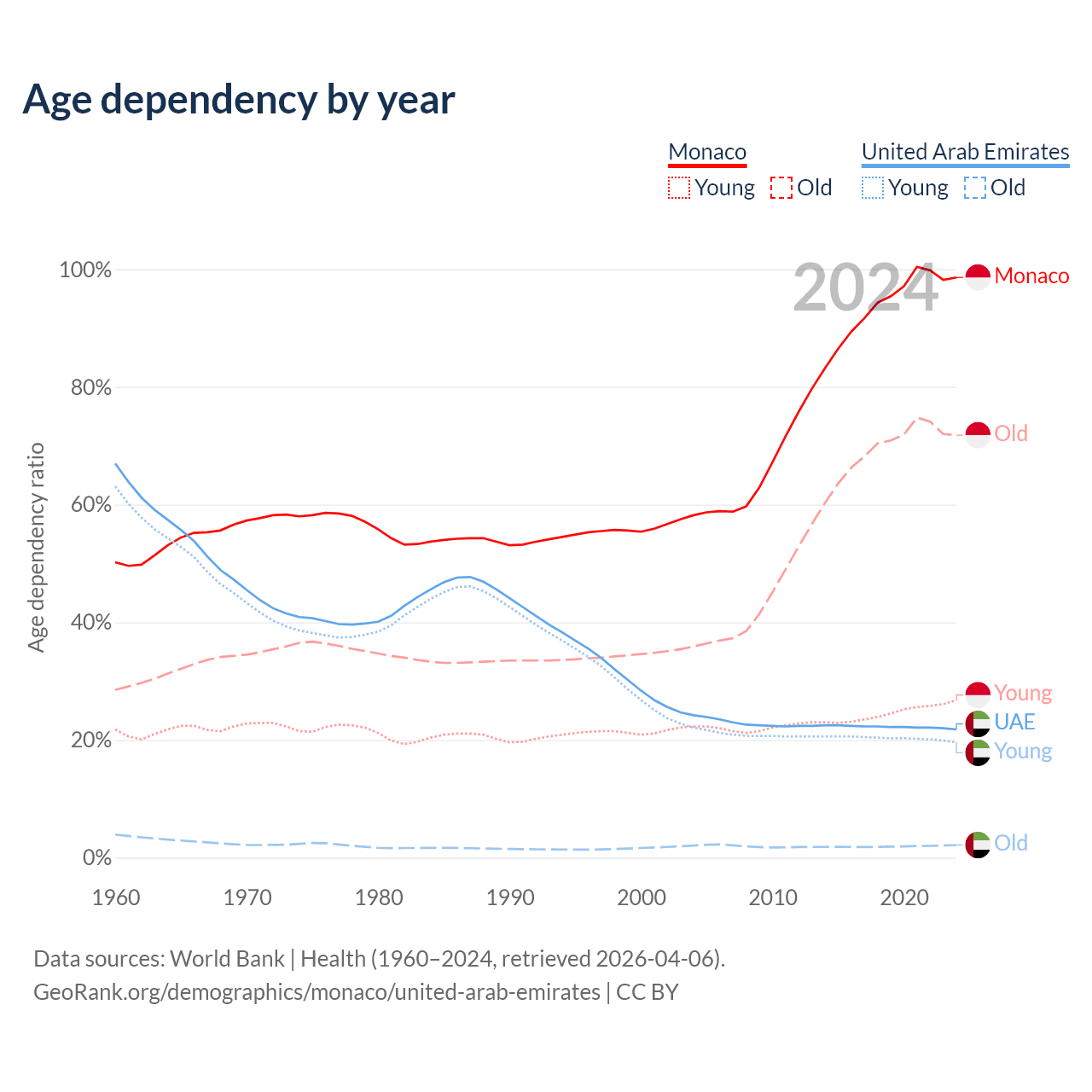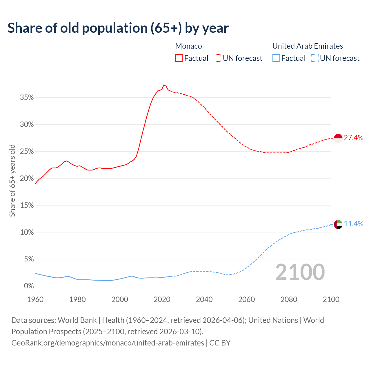 - The share of old-age demographic (65+) in Monaco is 36.2% vs 1.77% in the United Arab Emirates.
