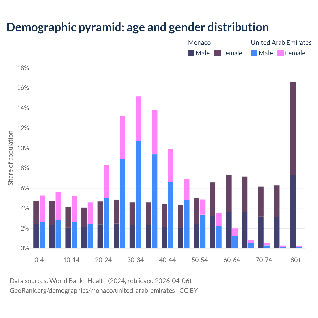 - Monaco is ranked 1/196 by median age (oldest to youngest) vs 91/196 for the United Arab Emirates.