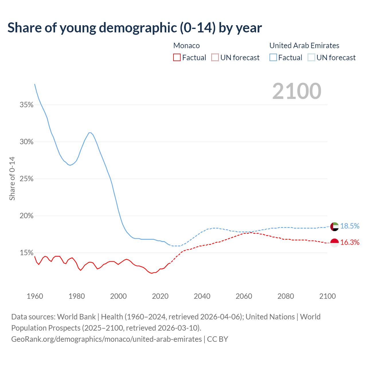 - The share of young demographic (0-15 years old) in Monaco is 13.5% vs 16.1% in the United Arab Emirates.