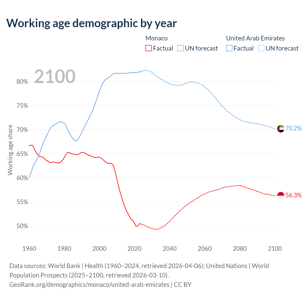 - Monaco has 19.2K working age adults (aged 15-64) vs 9.6M in the United Arab Emirates.